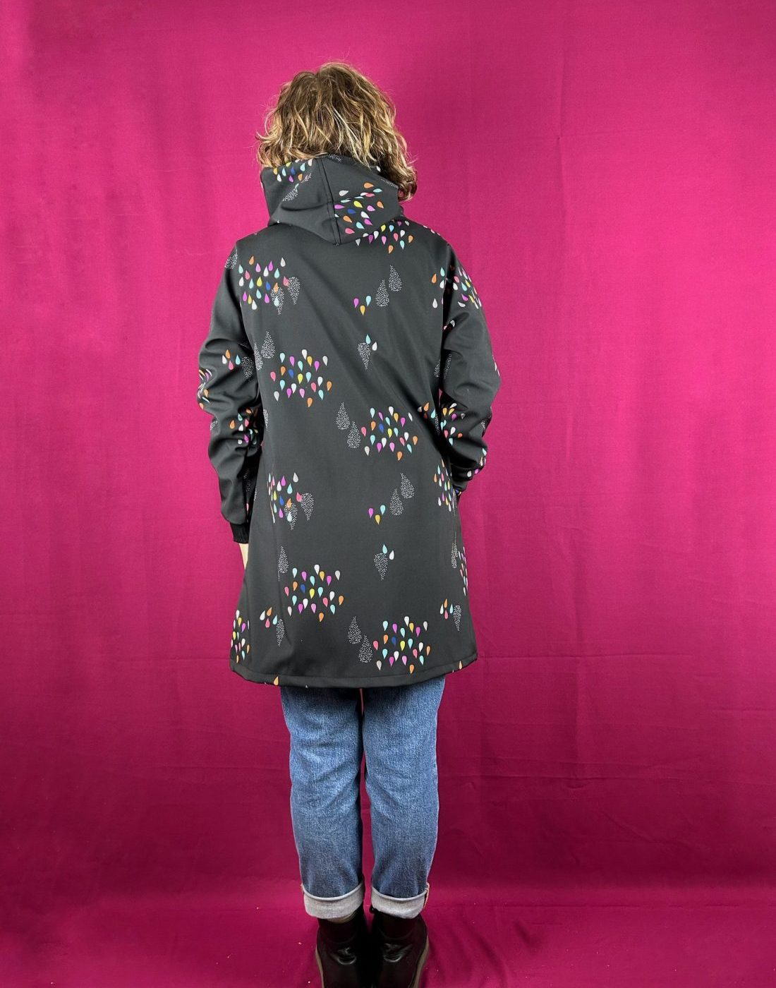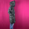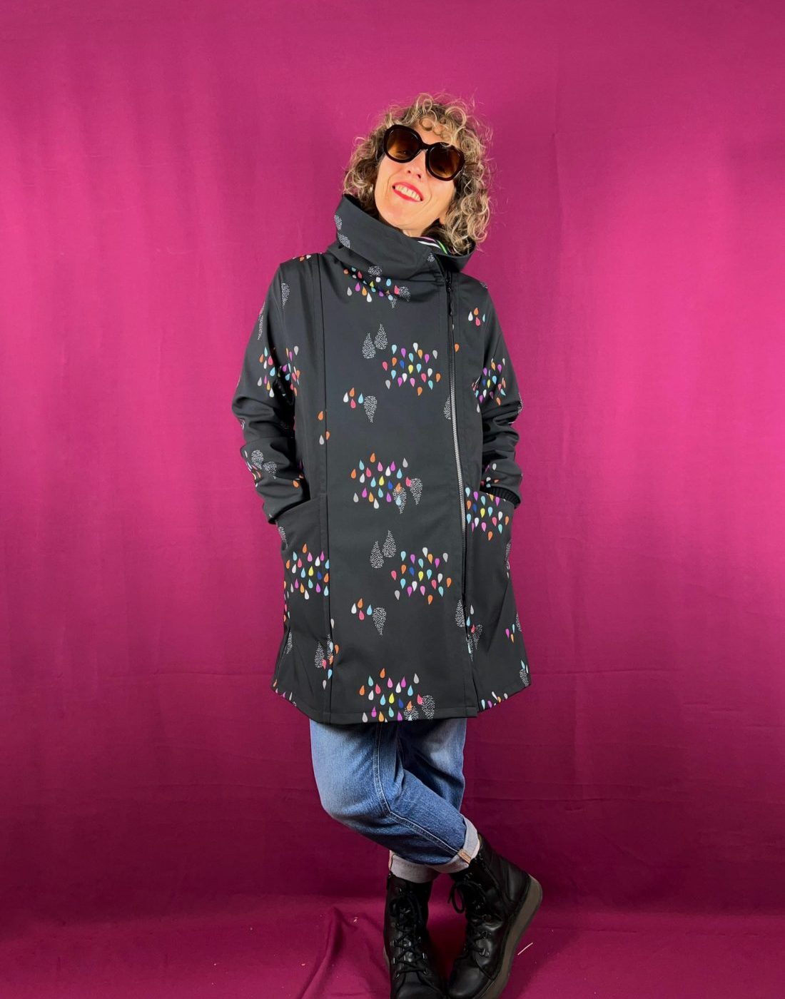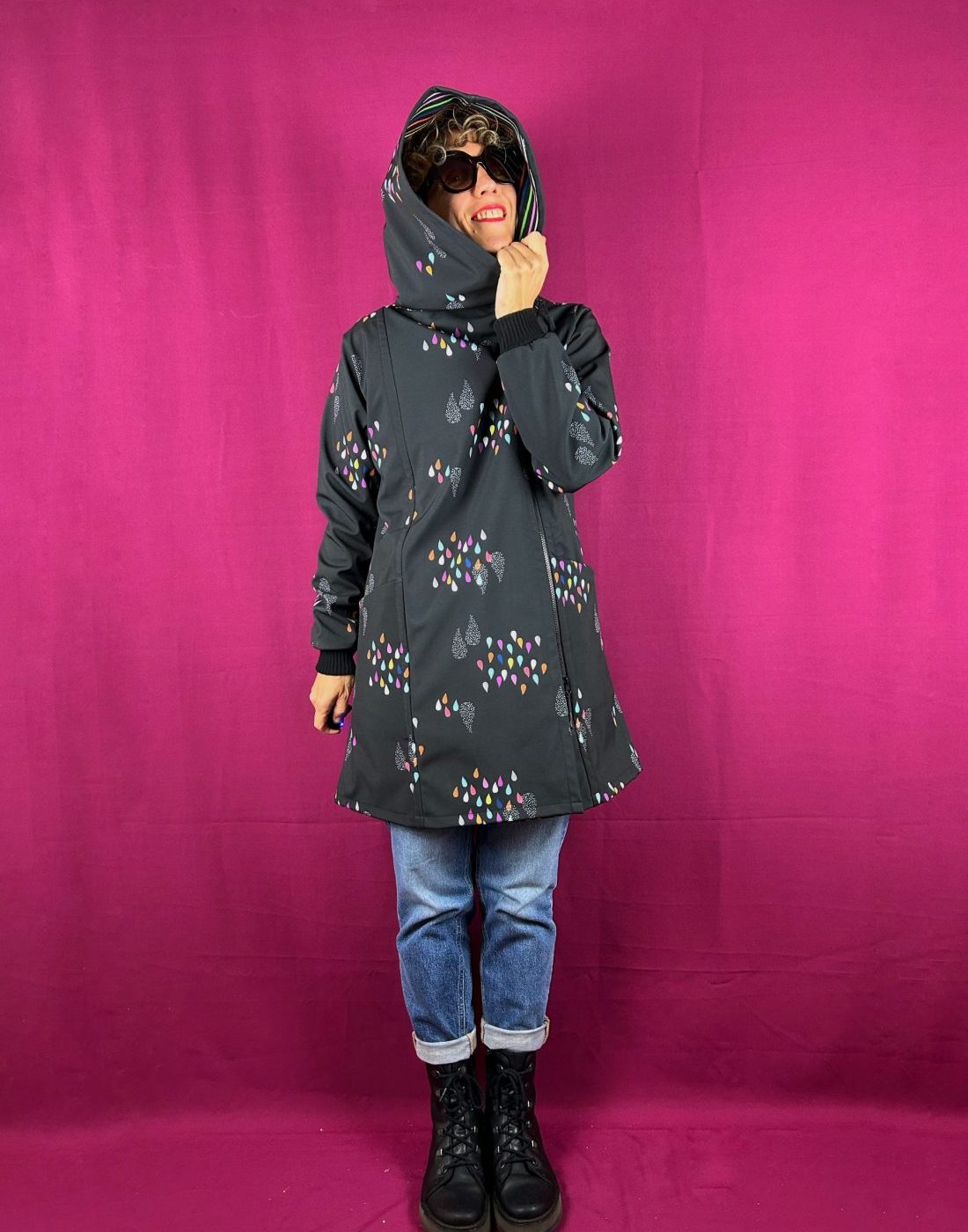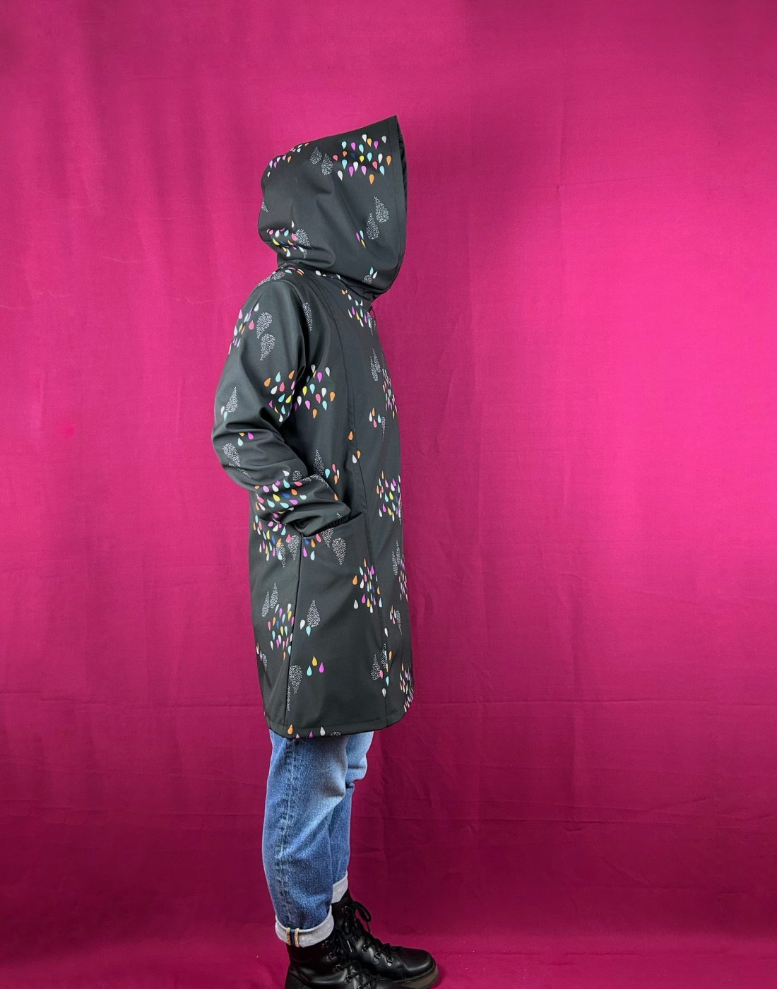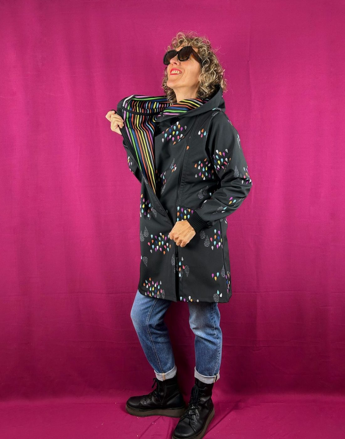 Abrigo Rex, largo medio, con cremallera lateral, bolsillos y super capucha. Hecho en tejido SoftShell, muy abrigado, resistente al agua y liviano.