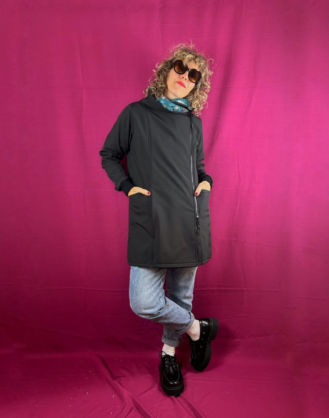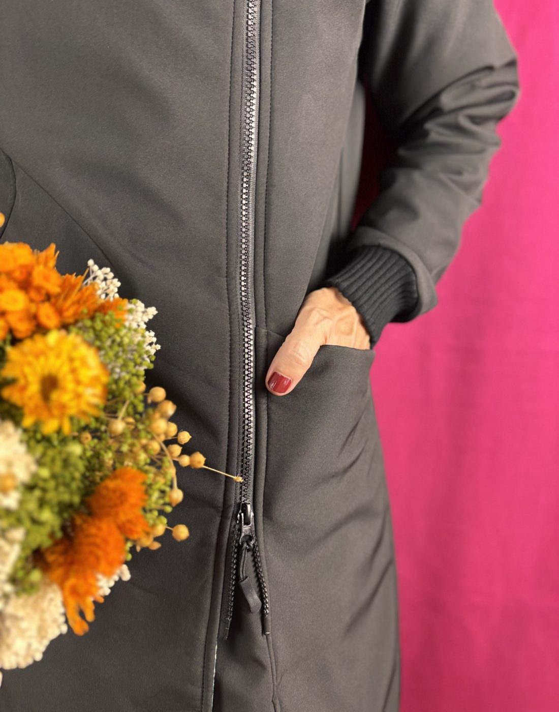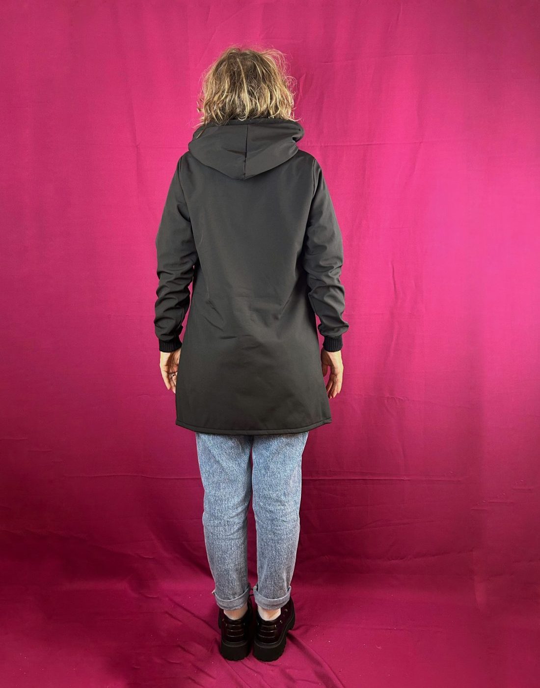 Abrigo de tejido Soft Shell largo medio, con cremallera lateral, de doble apertura, con super capucha y bolsillos delanteros. Lleva puños tejidos, en algodón 100%.