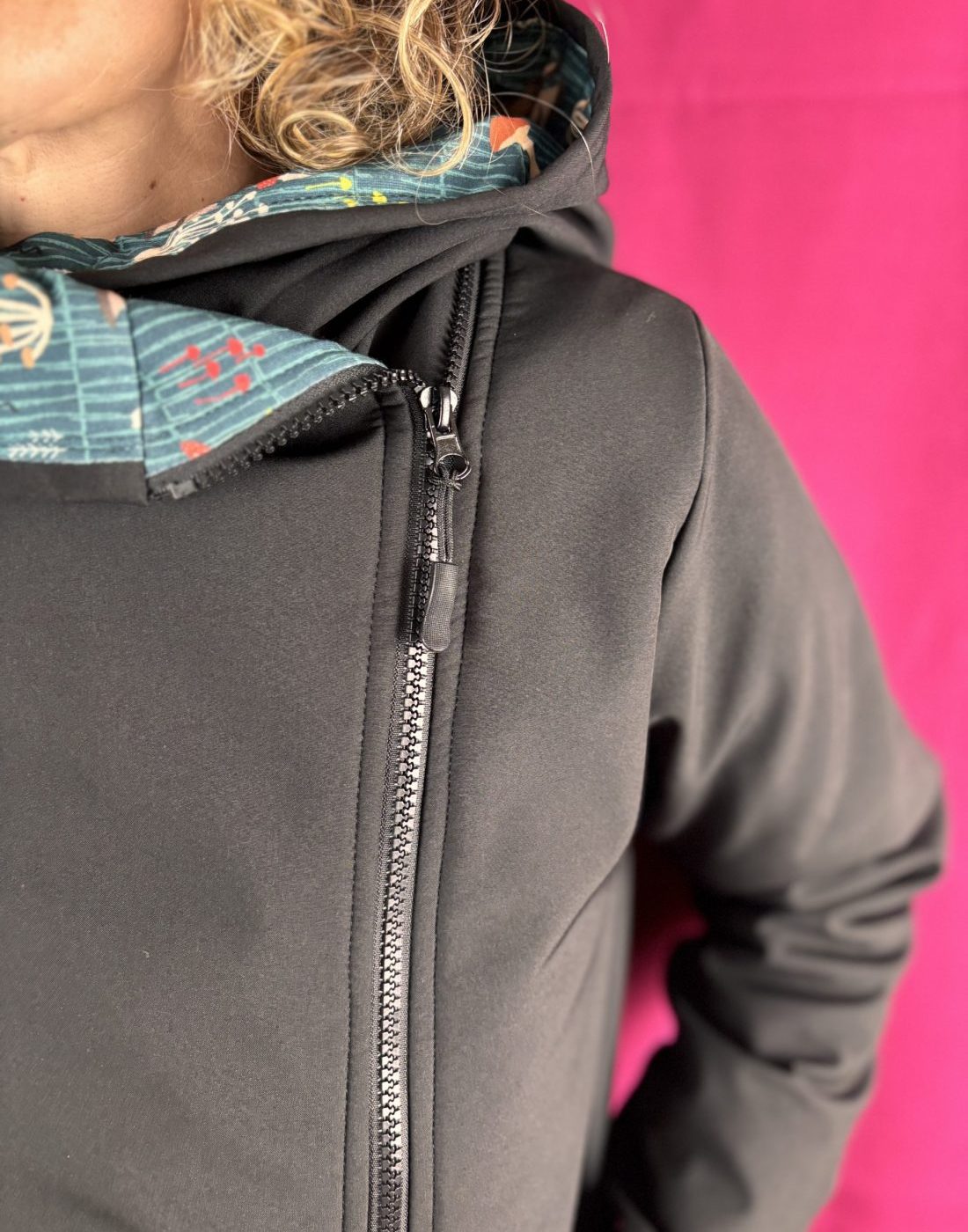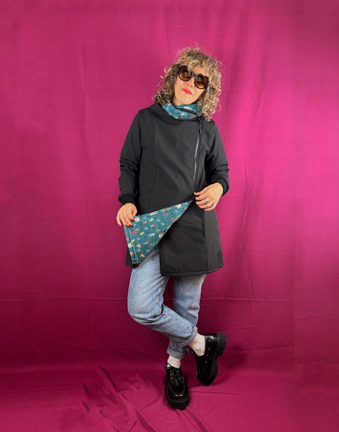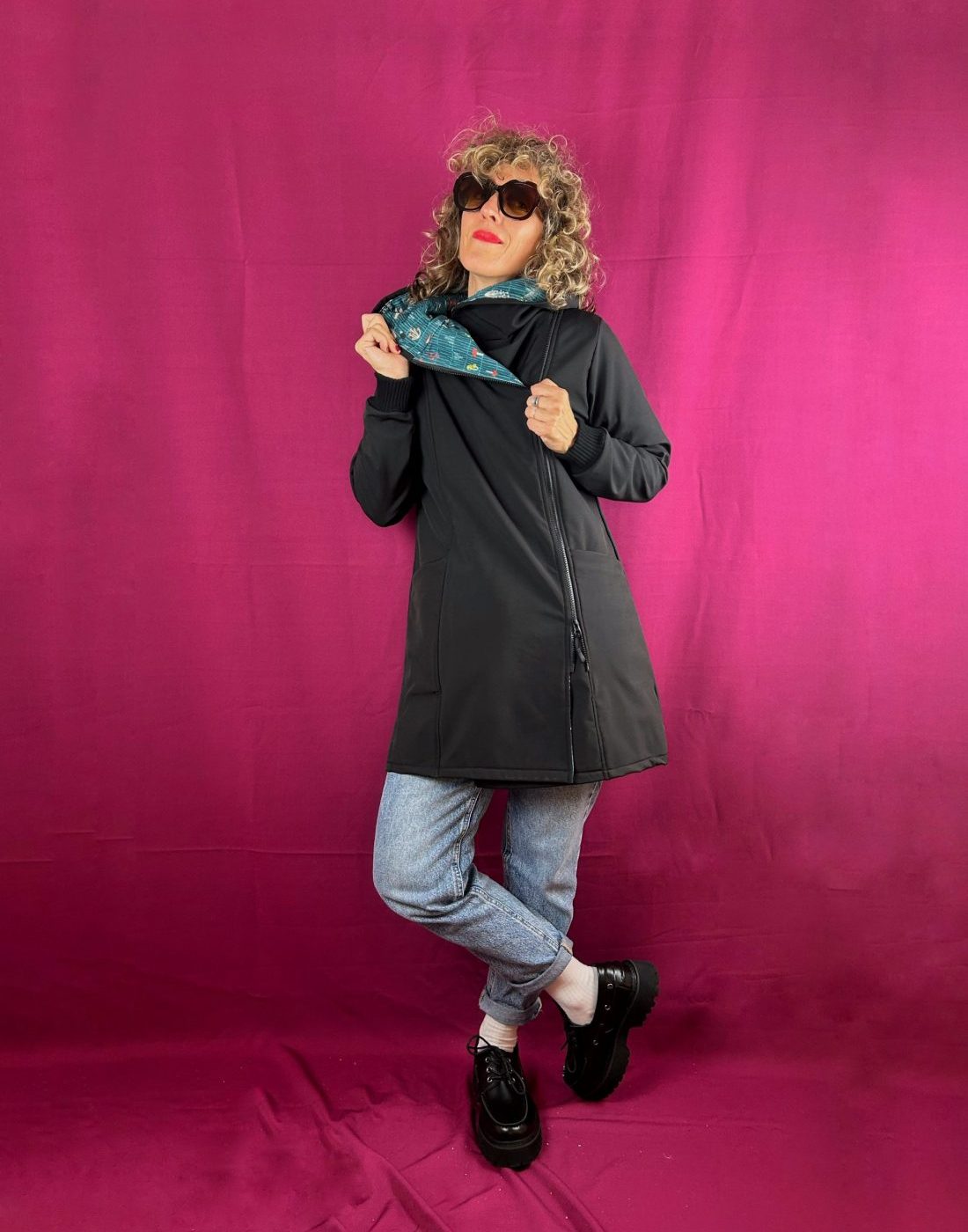 Abrigo de tejido Soft Shell largo medio, con cremallera lateral, de doble apertura, con super capucha y bolsillos delanteros. Lleva puños tejidos, en algodón 100%.