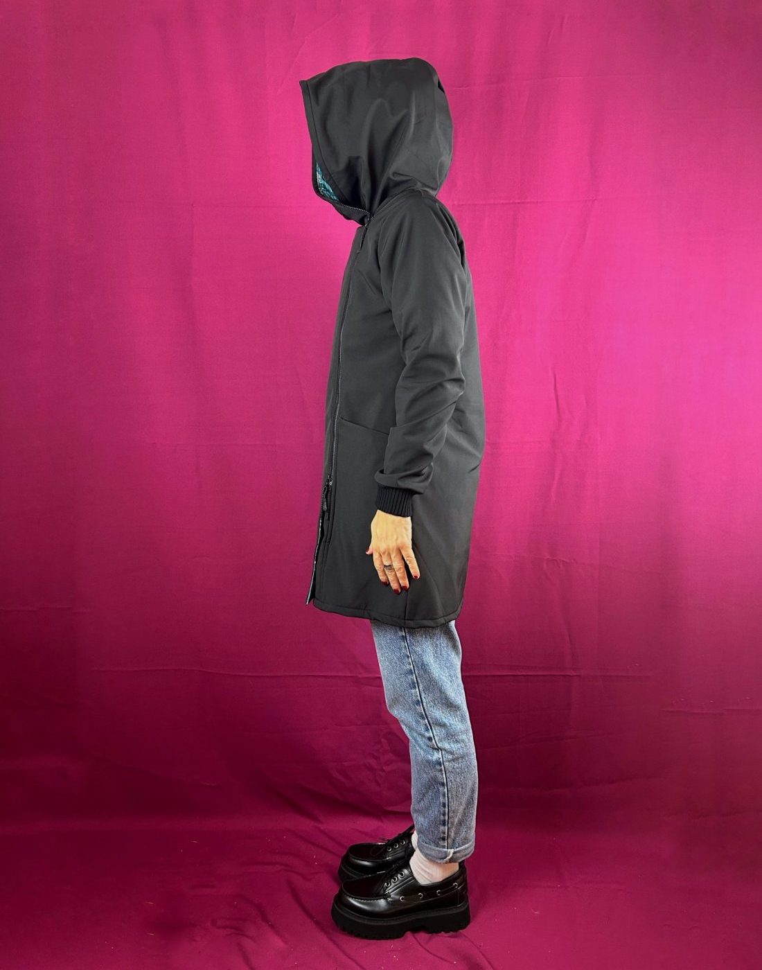 Abrigo Rex, largo medio, con cremallera lateral, bolsillos y super capucha forrada. Hecho en tejido SoftShell, muy abrigado, resistente al agua y liviano.