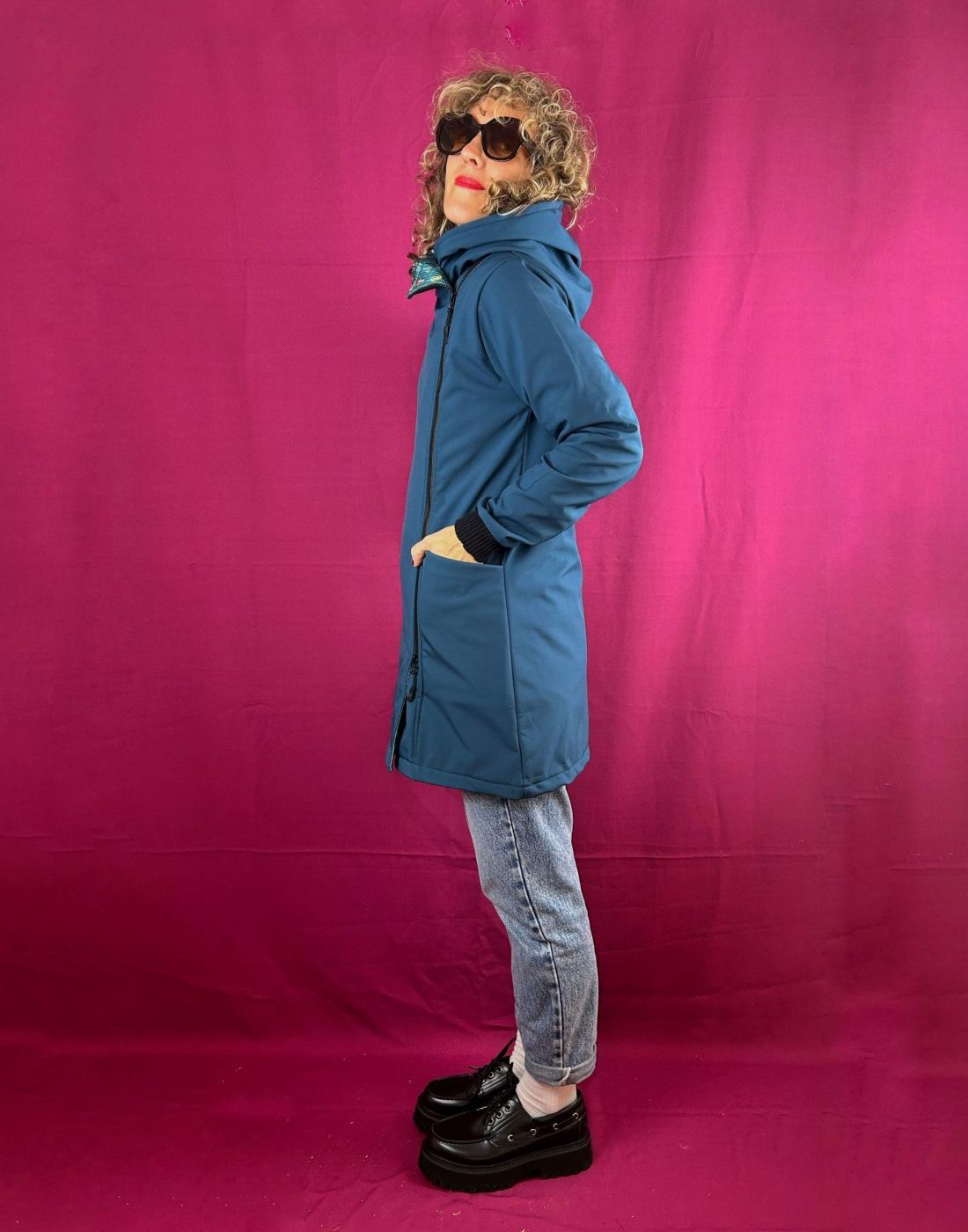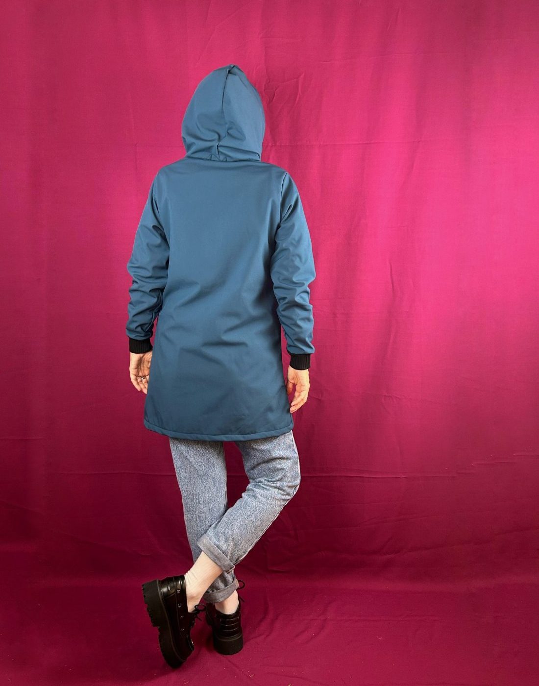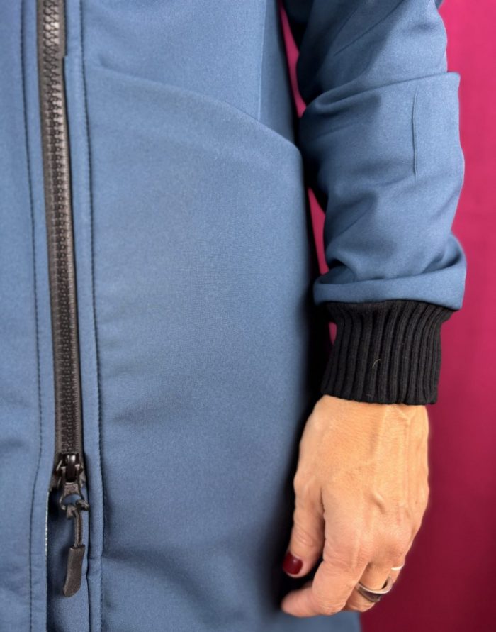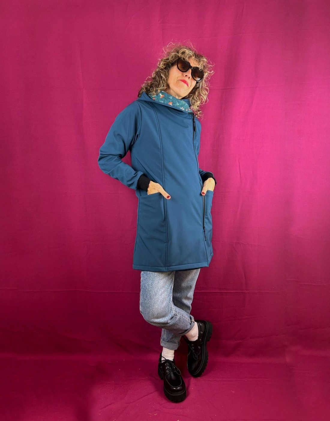Abrigo de tejido Soft Shell largo medio, con cremallera lateral, de doble apertura, con super capucha y bolsillos delanteros. Lleva puños tejidos, en algodón 100%.