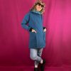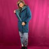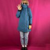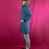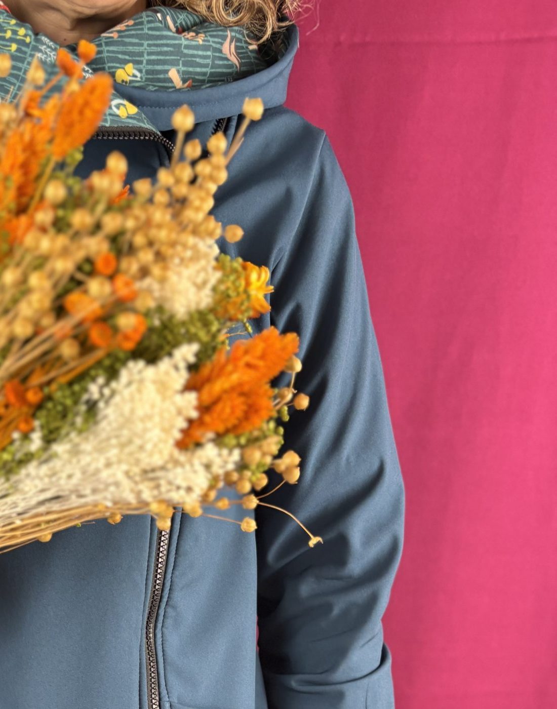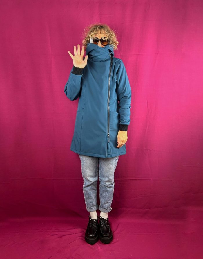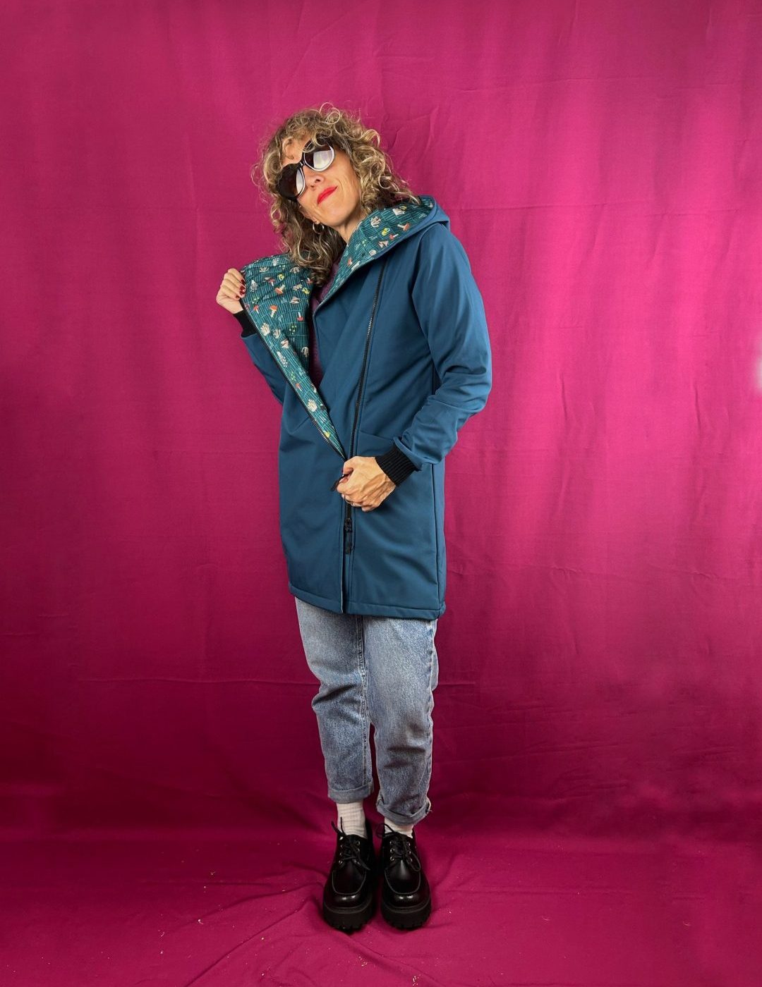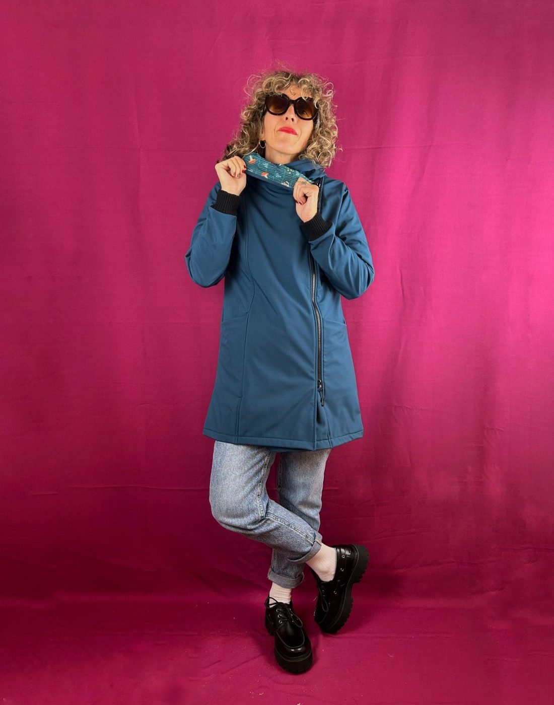 Abrigo de tejido Soft Shell largo medio, con cremallera lateral, de doble apertura, con super capucha y bolsillos delanteros. Lleva puños tejidos, en algodón 100%.