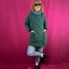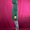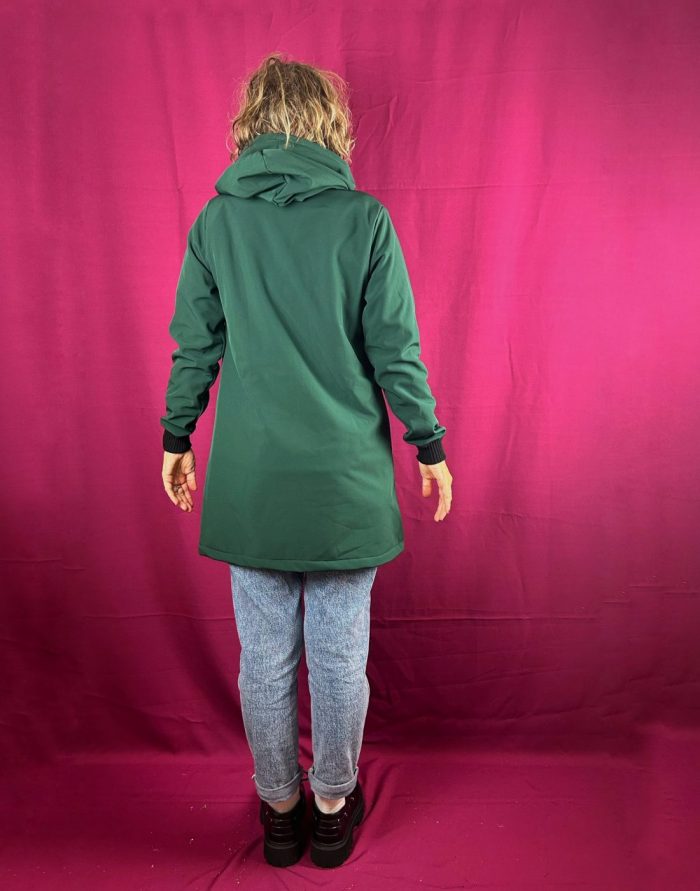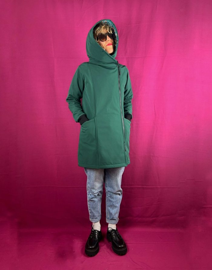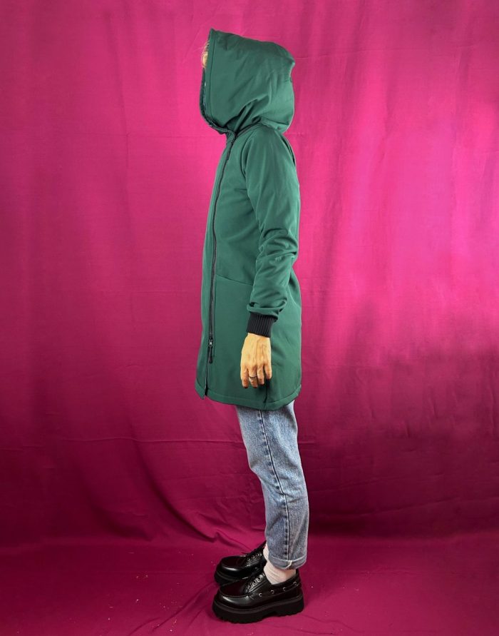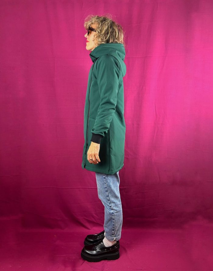 Abrigo de tejido Soft Shell largo medio, con cremallera lateral, de doble apertura, con super capucha y bolsillos delanteros. Lleva puños tejidos, en algodón 100%.