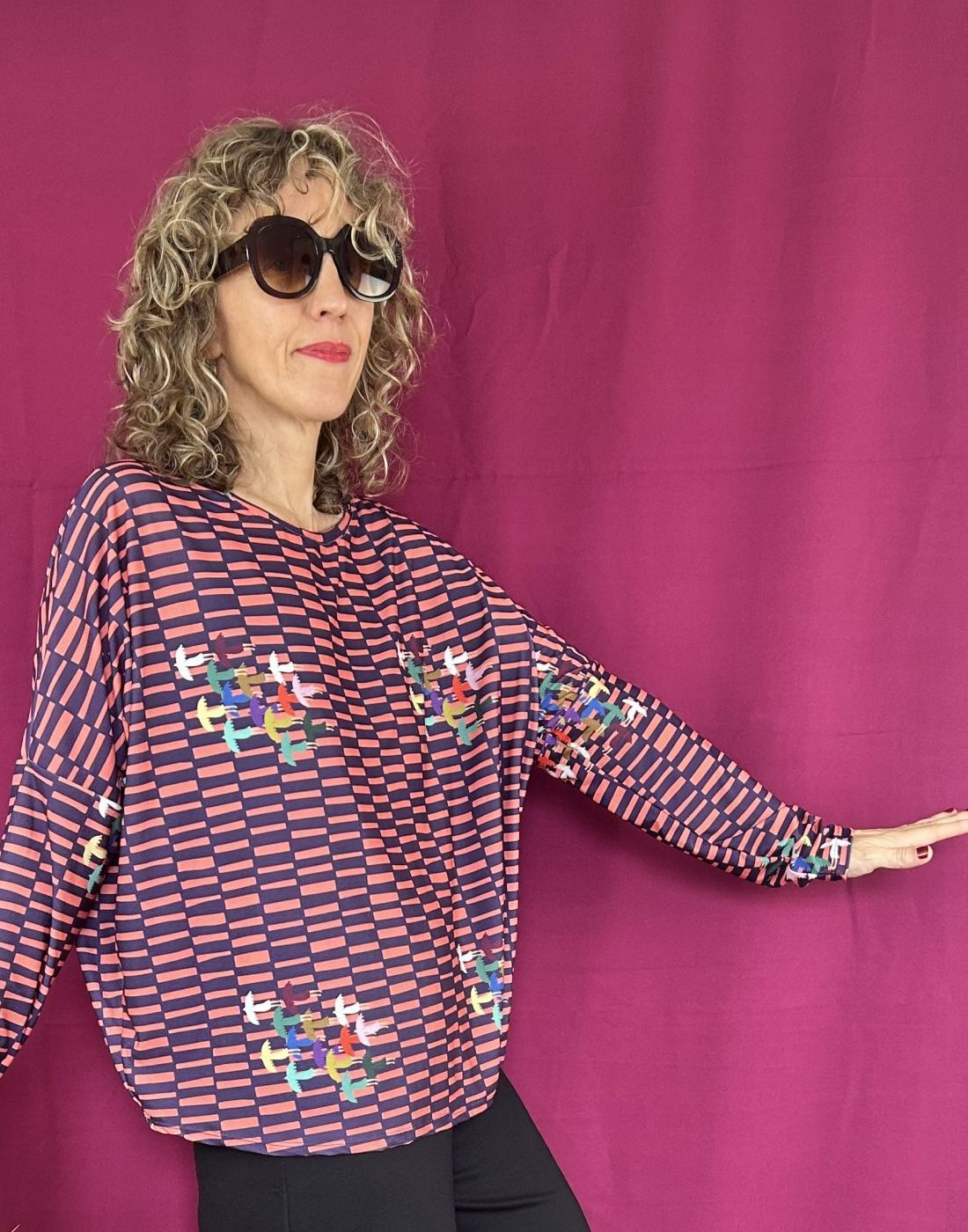 Camiseta de cuello redondo, de tejido de punto elástico. Tiene un tacto super suave y agradable. Patrón amplio con manga larga. Disponible en talla única amplia.