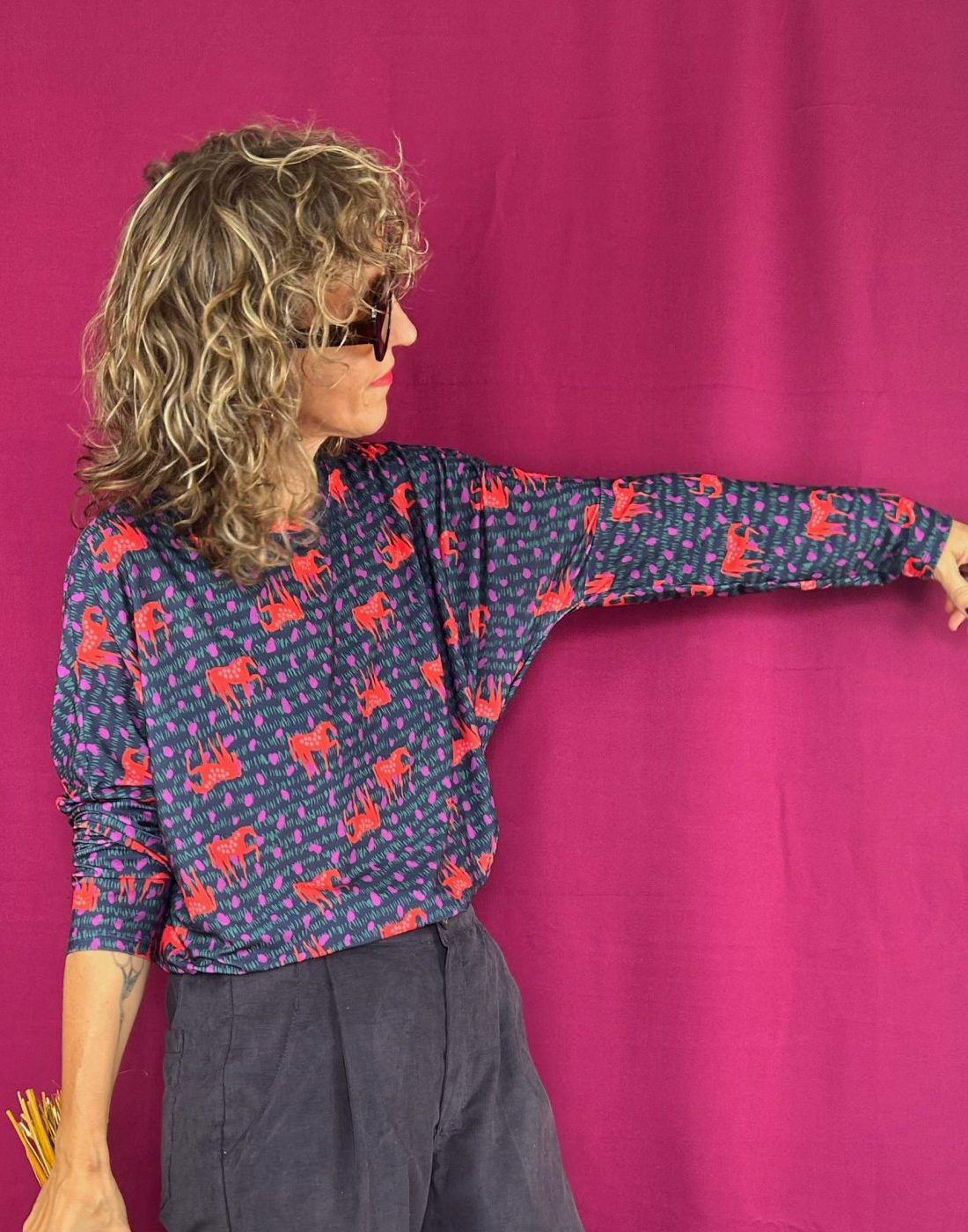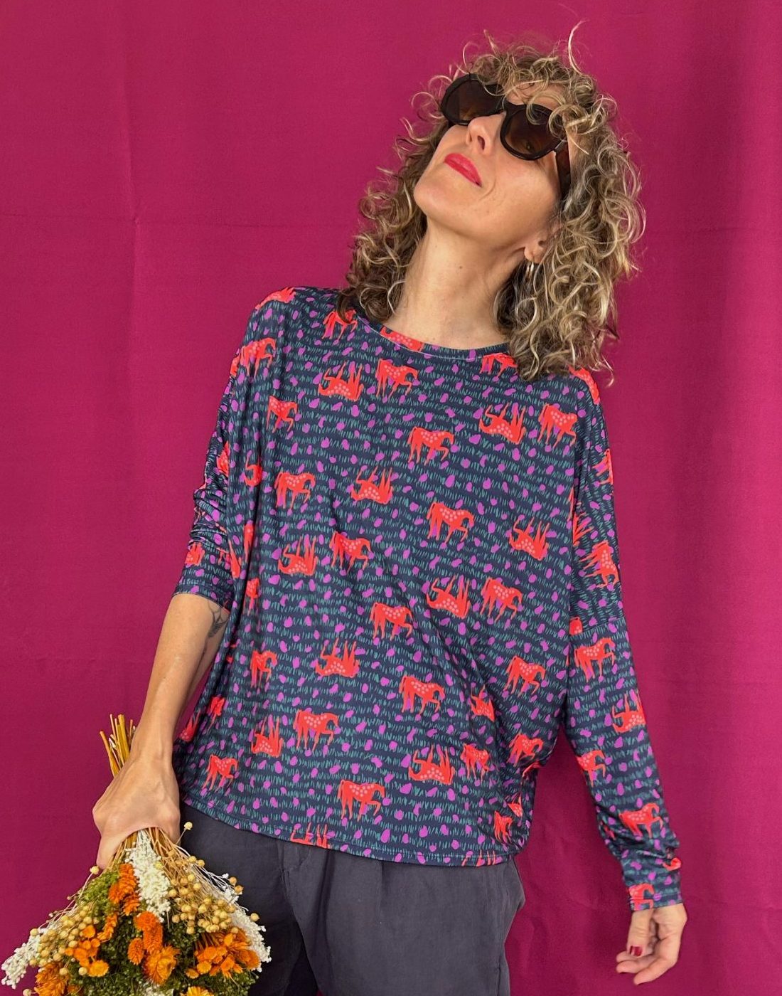Camiseta de cuello redondo, de tejido de punto elástico. Tiene un tacto super suave y agradable. Patrón amplio con manga larga. Disponible en talla única amplia.