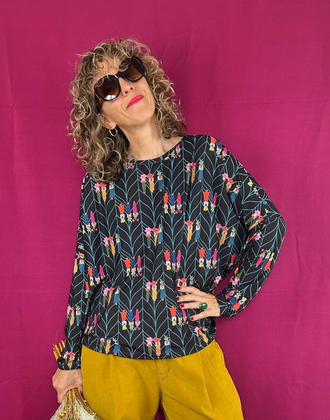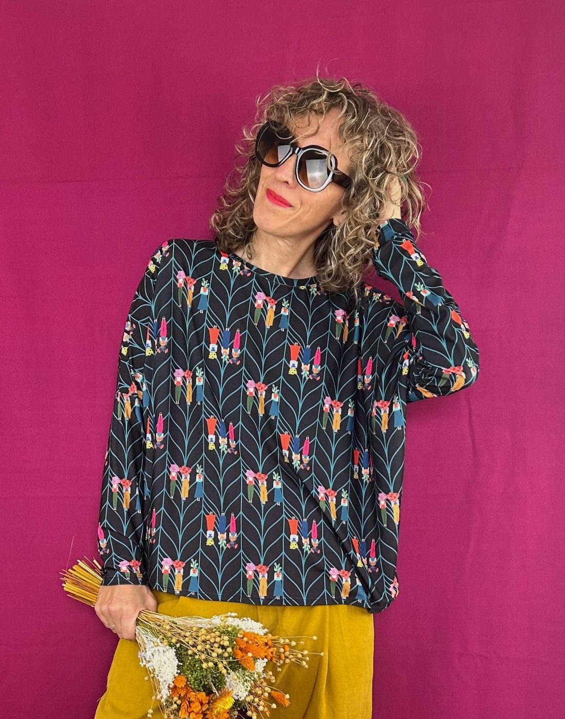Camiseta de cuello redondo, de tejido de punto elástico. Tiene un tacto super suave y agradable. Patrón amplio con manga larga. Disponible en talla única amplia.