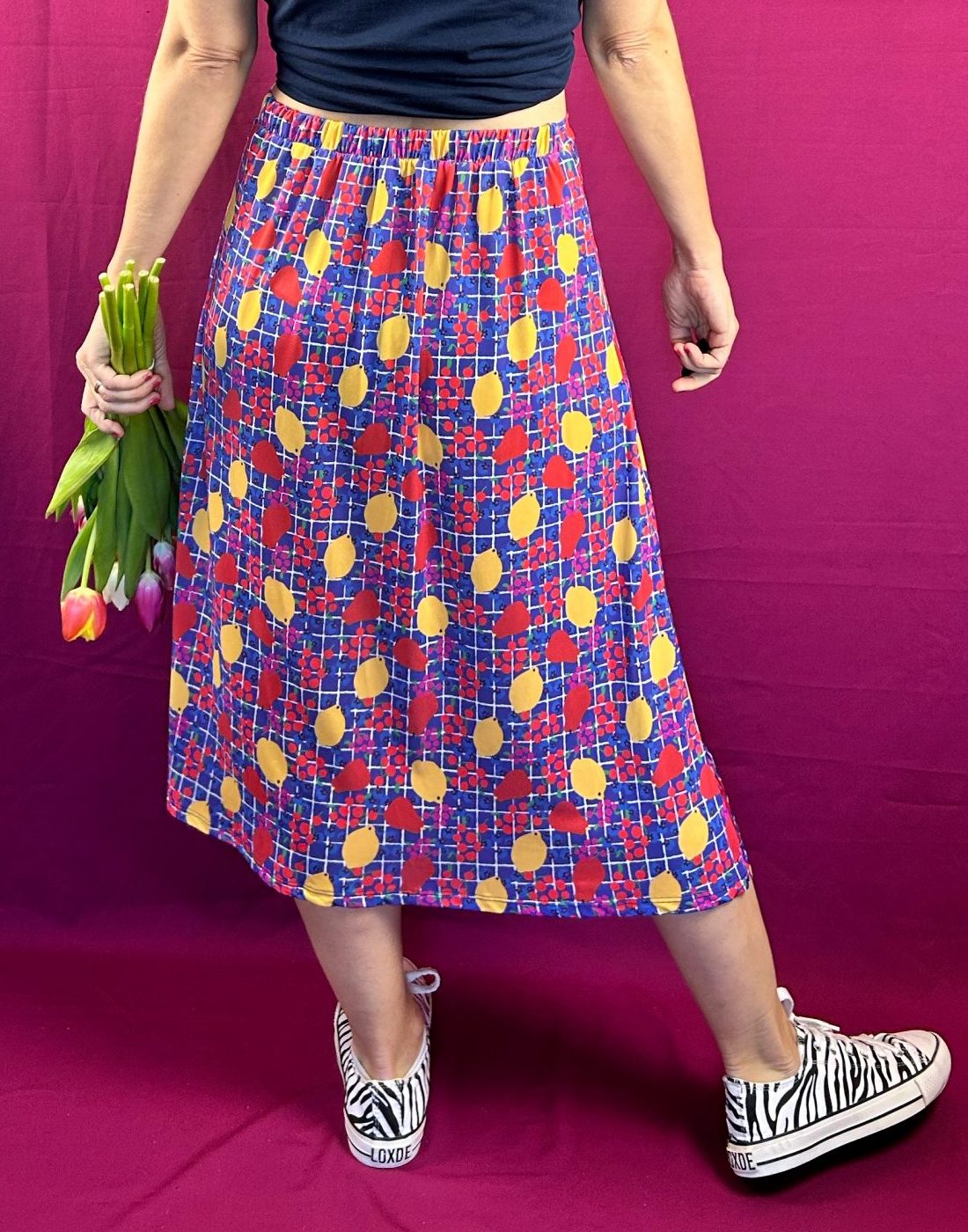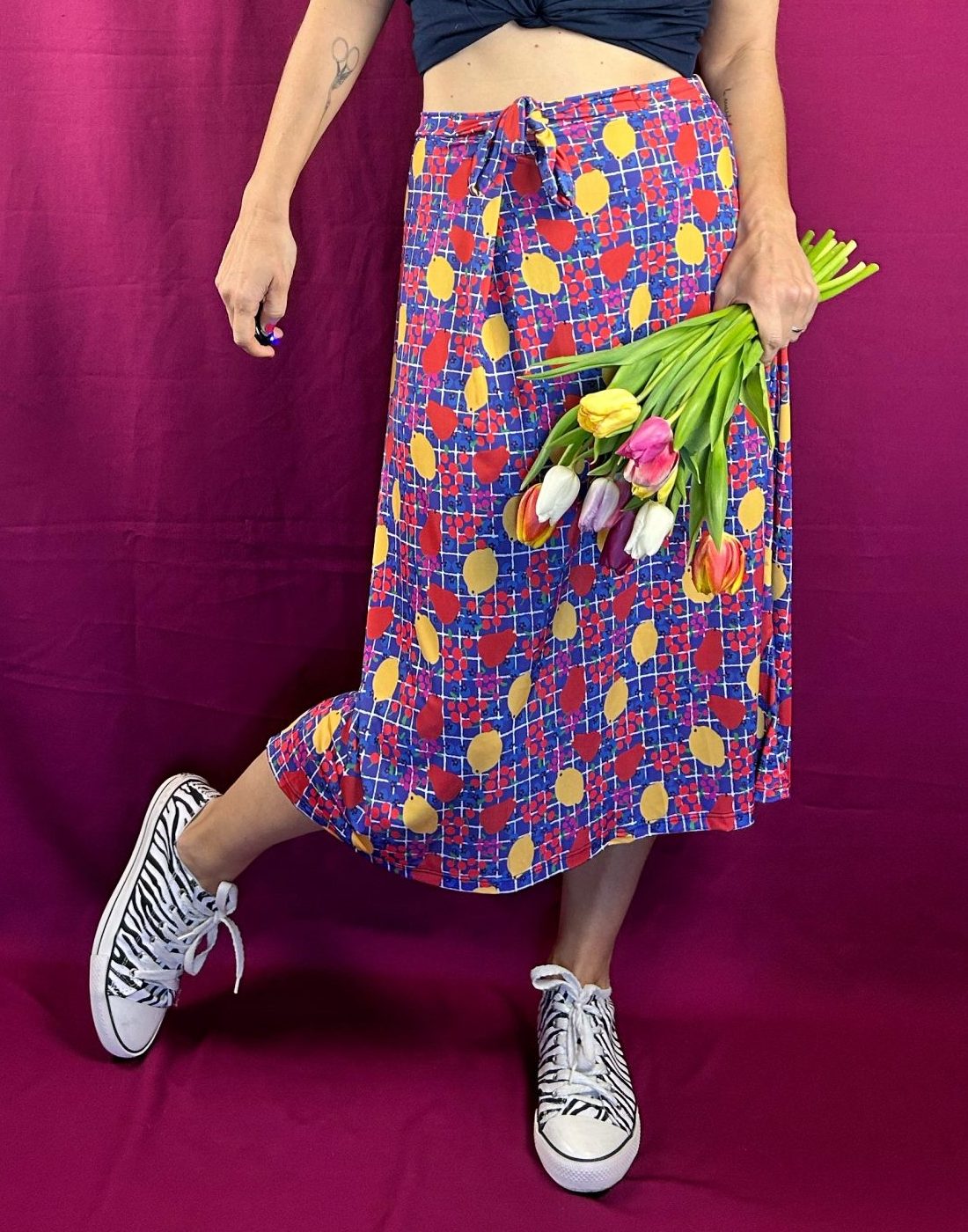 Falda midi de tejido de punto elástico. Lleva un pliegue lateral delantero super bonito, lazo en la cintura y goma elástica en la parte de atrás. Disponible en 3 tallas amplias.
