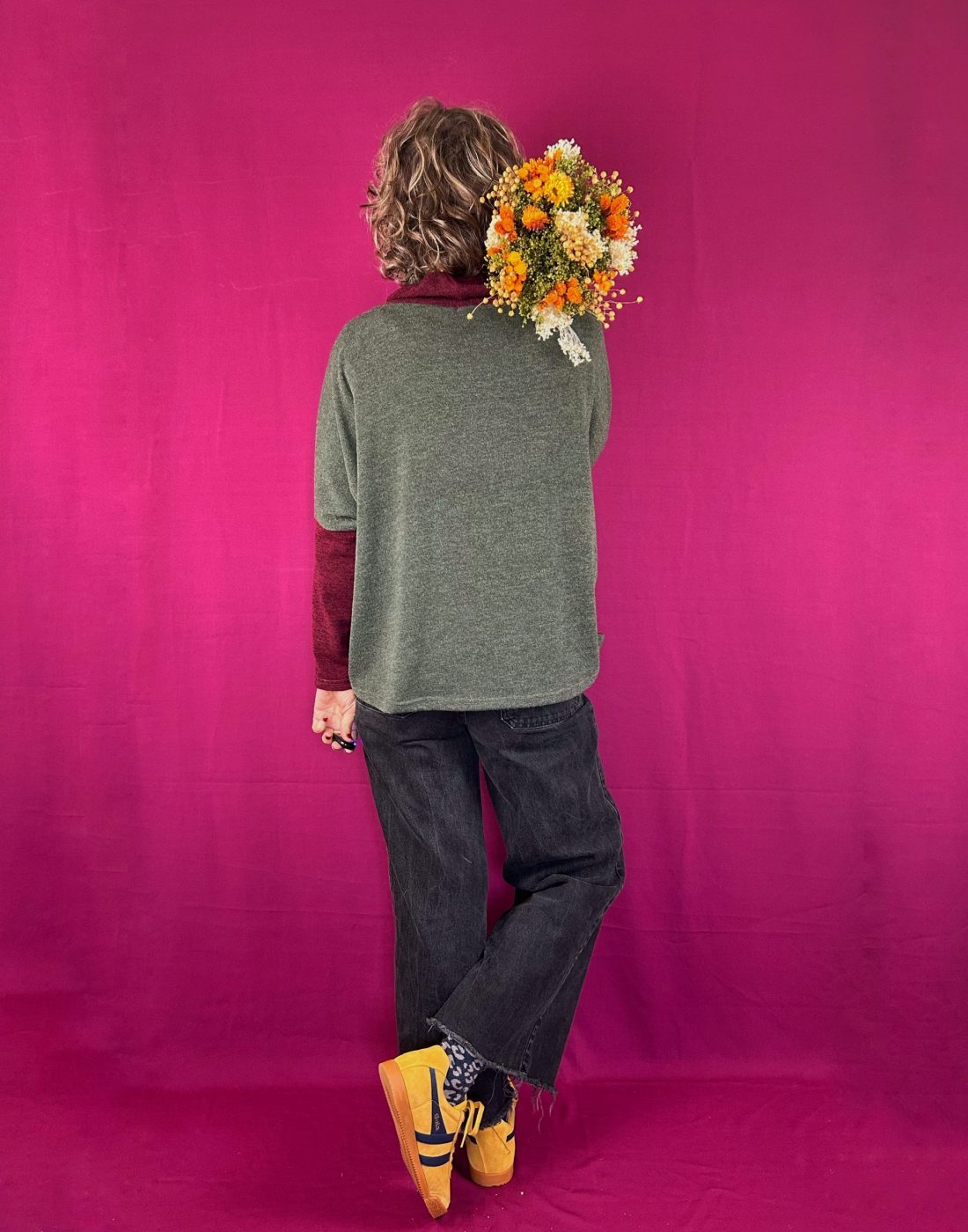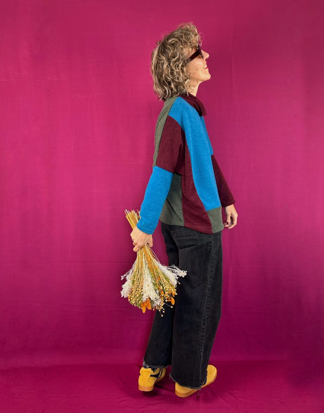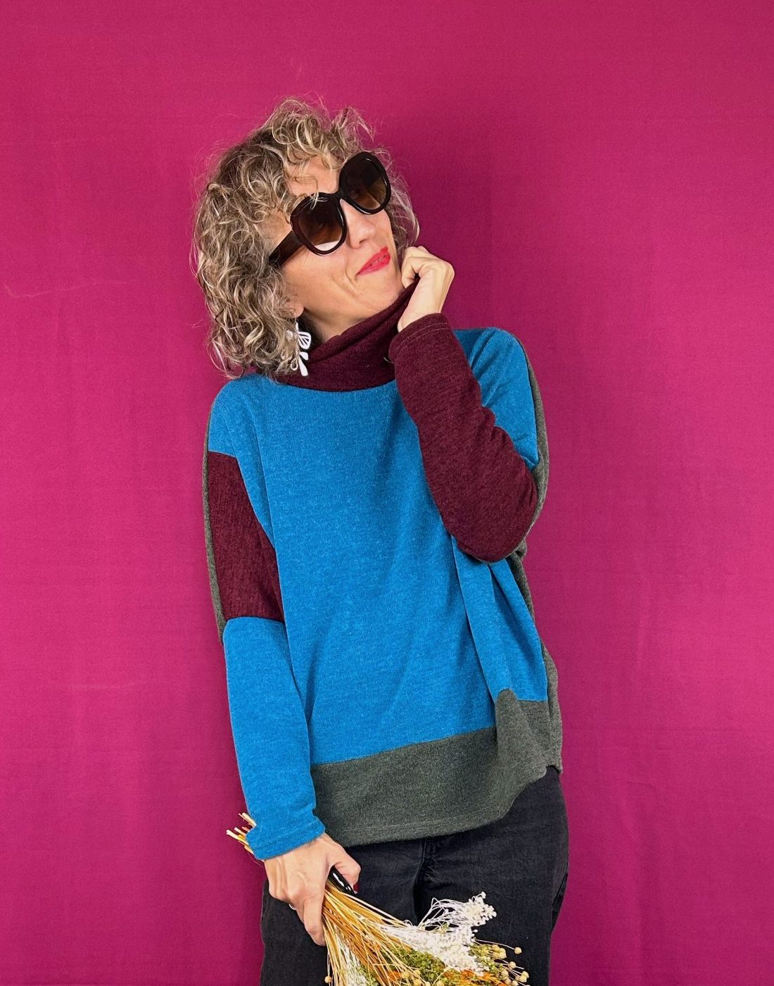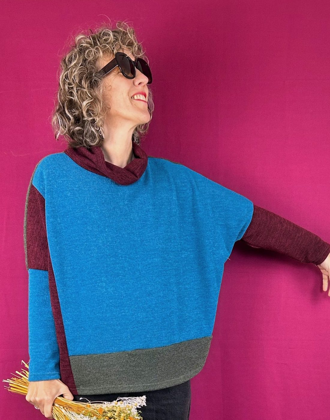 Jersey de cuello tortuga, de tejido de lanilla elástico. Tiene un tacto super suave y agradable. Patrón amplio con manga larga y recortes delanteros. Disponible en talla única. Tallas 36 a 44 aproximadamente.