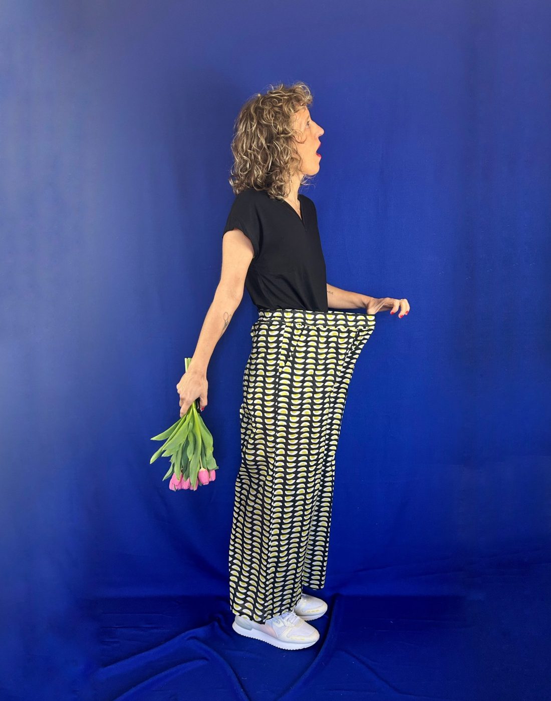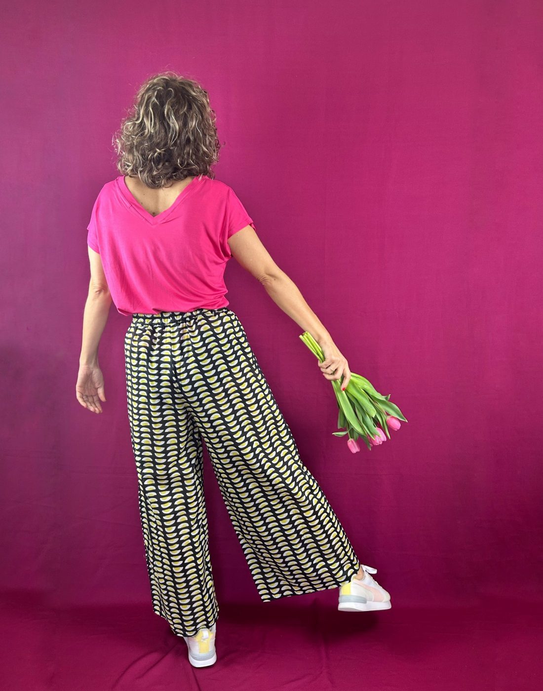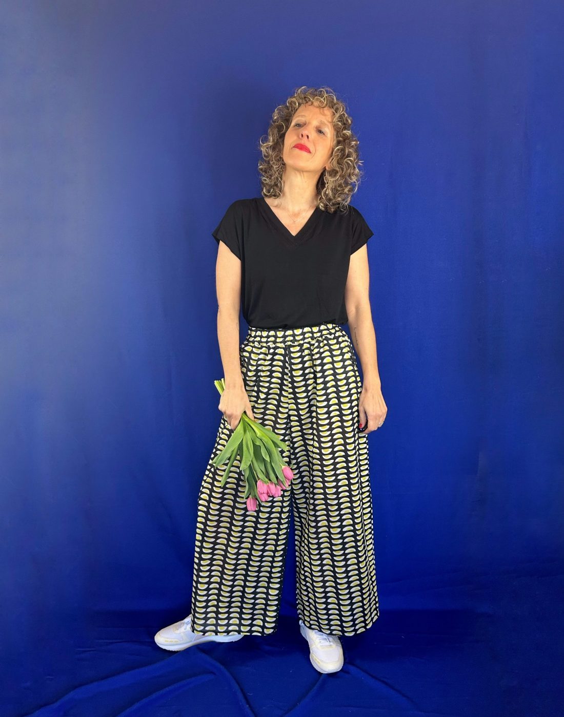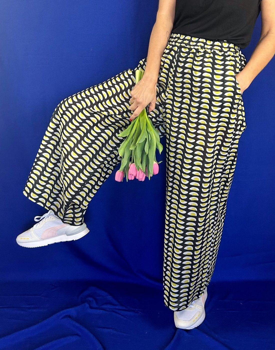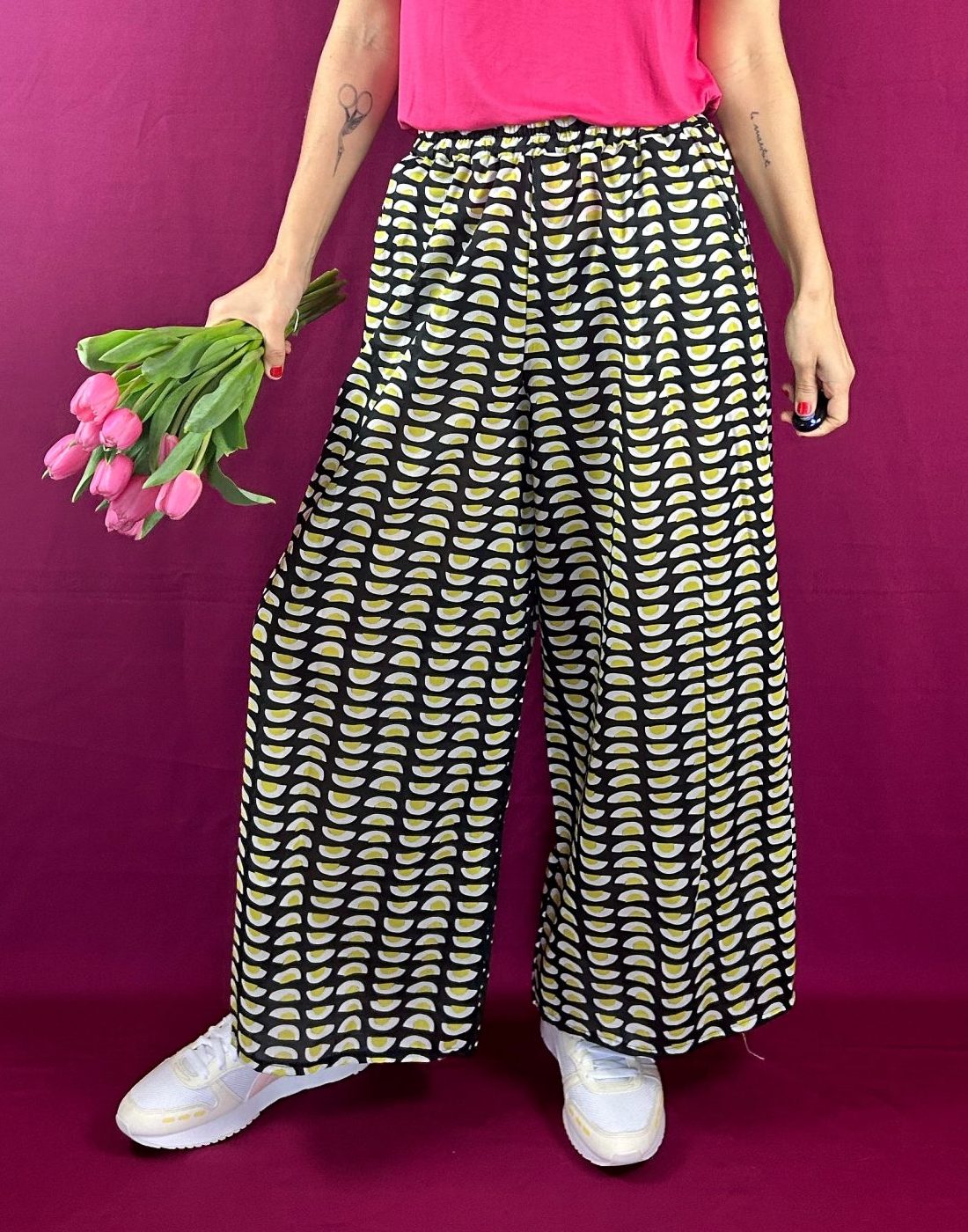 Patrón amplio, de pierna ancha, con bolsillos laterales. Tiene una textura super bonita, al tacto es muy suave y agradable.