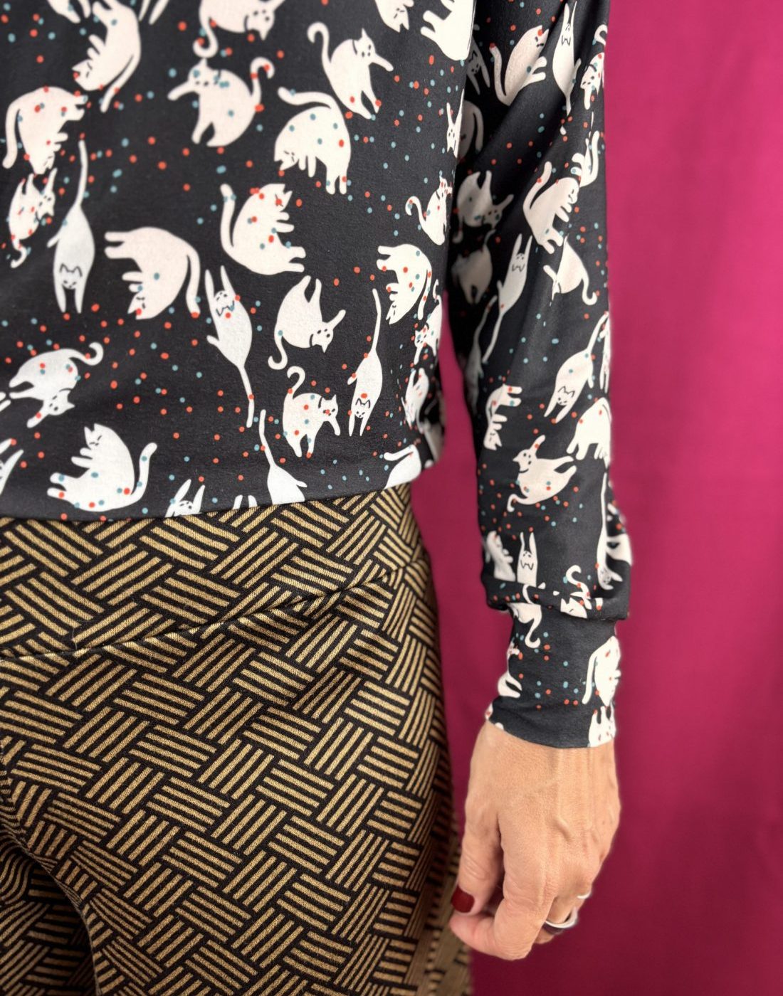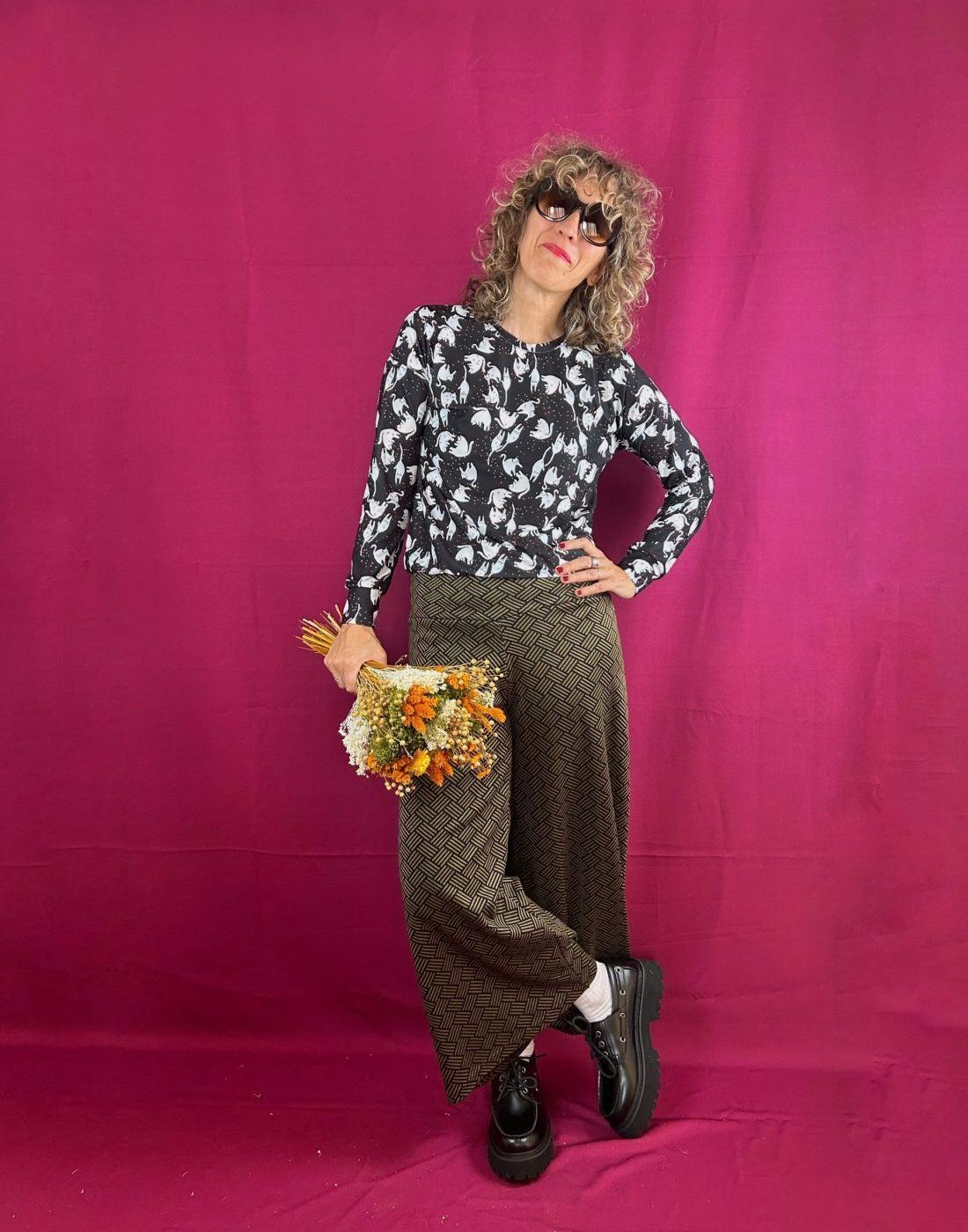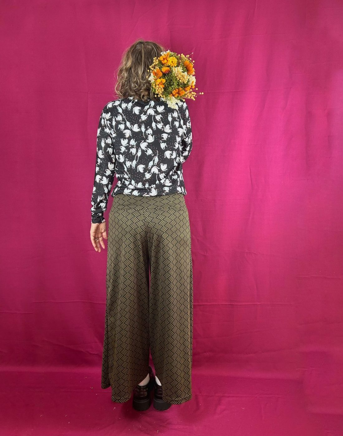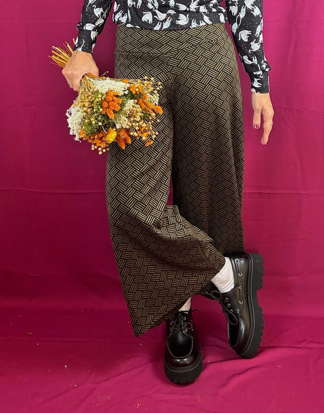 Patrón de pierna ancha, de tejido de punto elástico, tiene una textura super bonita, al tacto es muy suave y agradable.