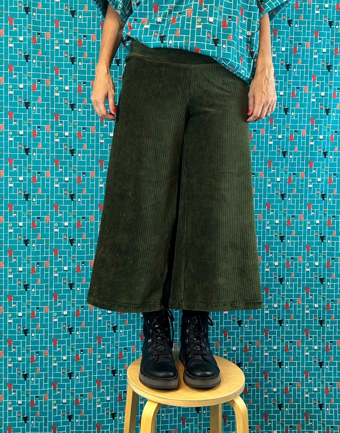 Patrón cropped, amplio, de pierna ancha, de tejido de pana elástico, tiene una textura super bonita, al tacto es muy suave y agradable.