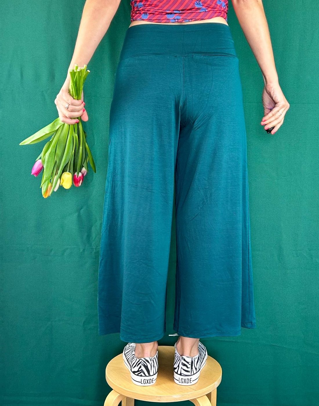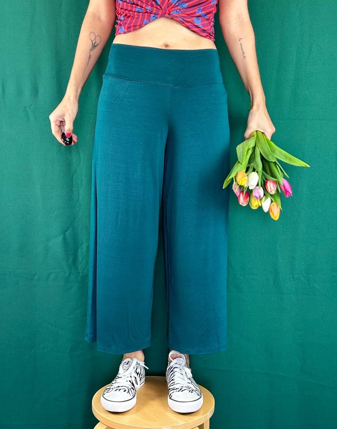 Patrón cropped, amplio, de pierna ancha, de tejido de punto elástico, tiene una textura super bonita, al tacto es muy suave y agradable.