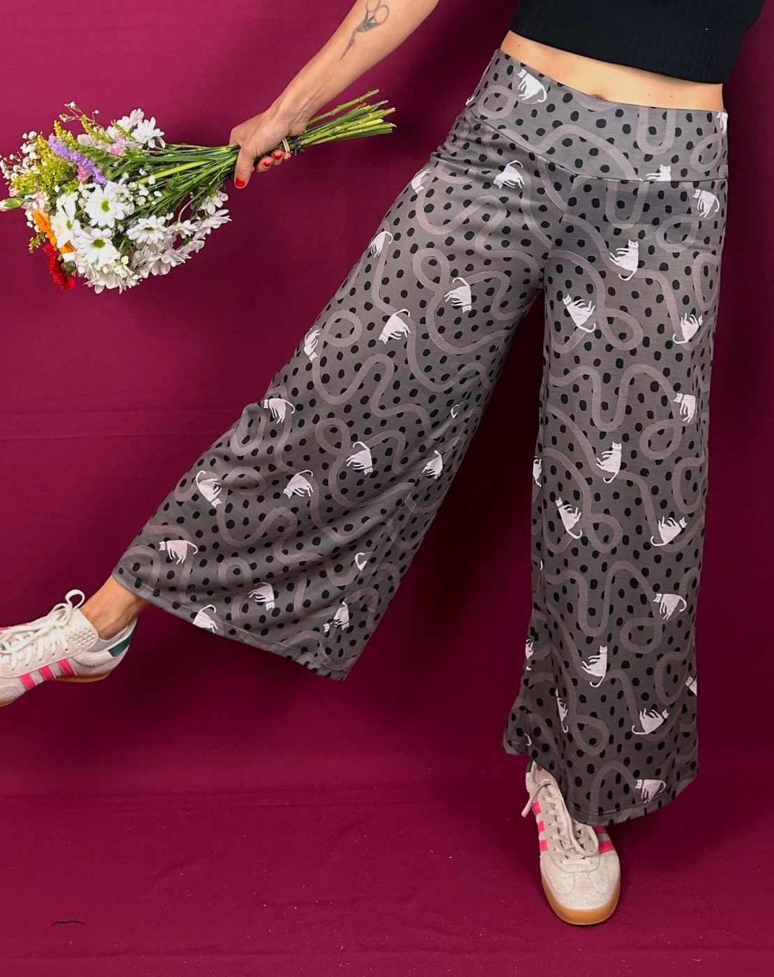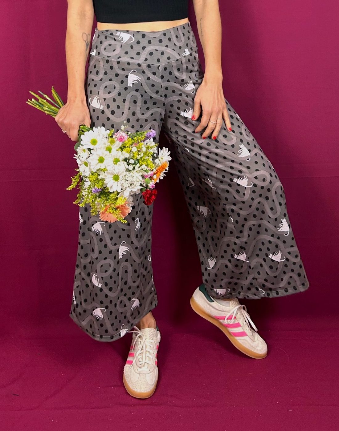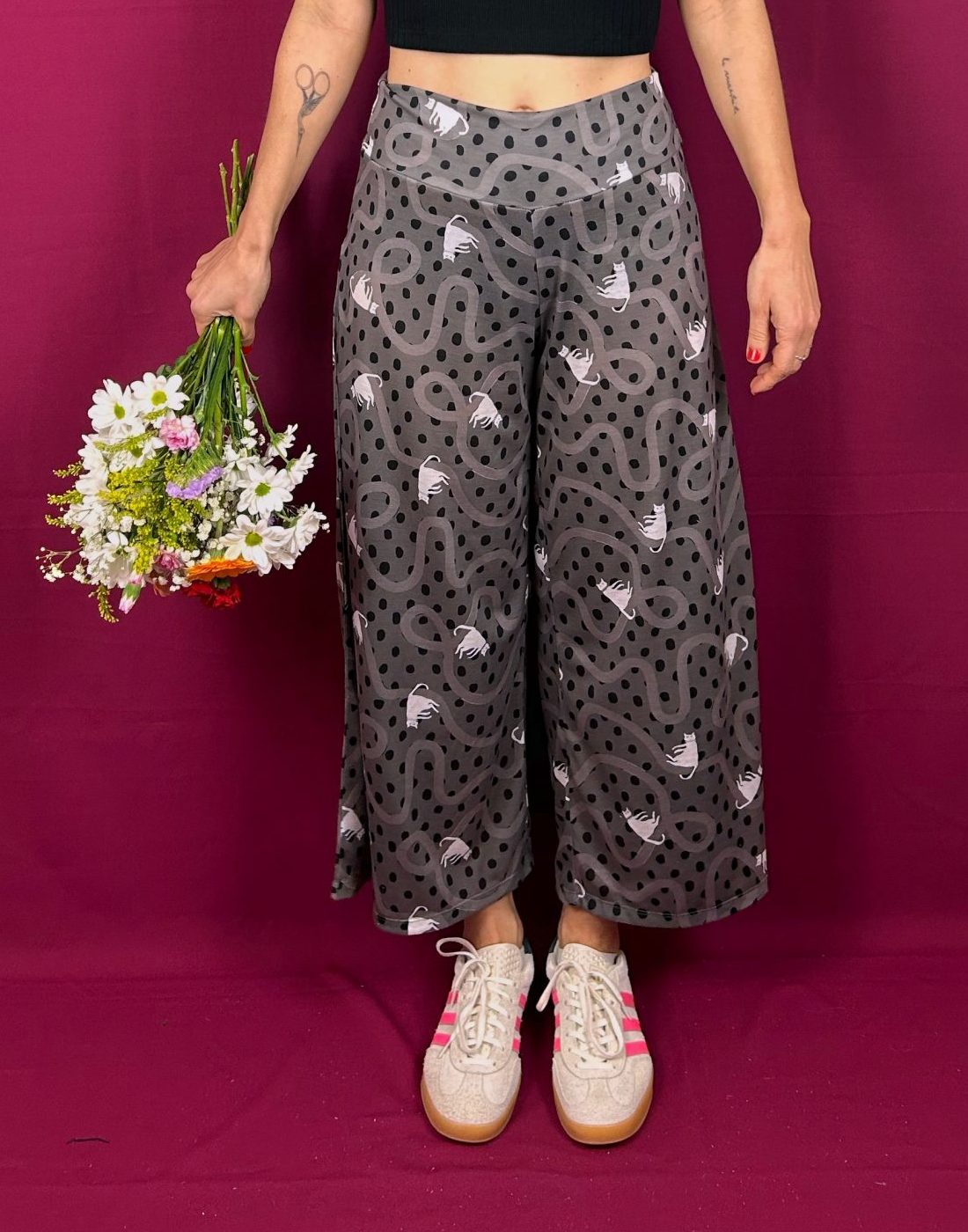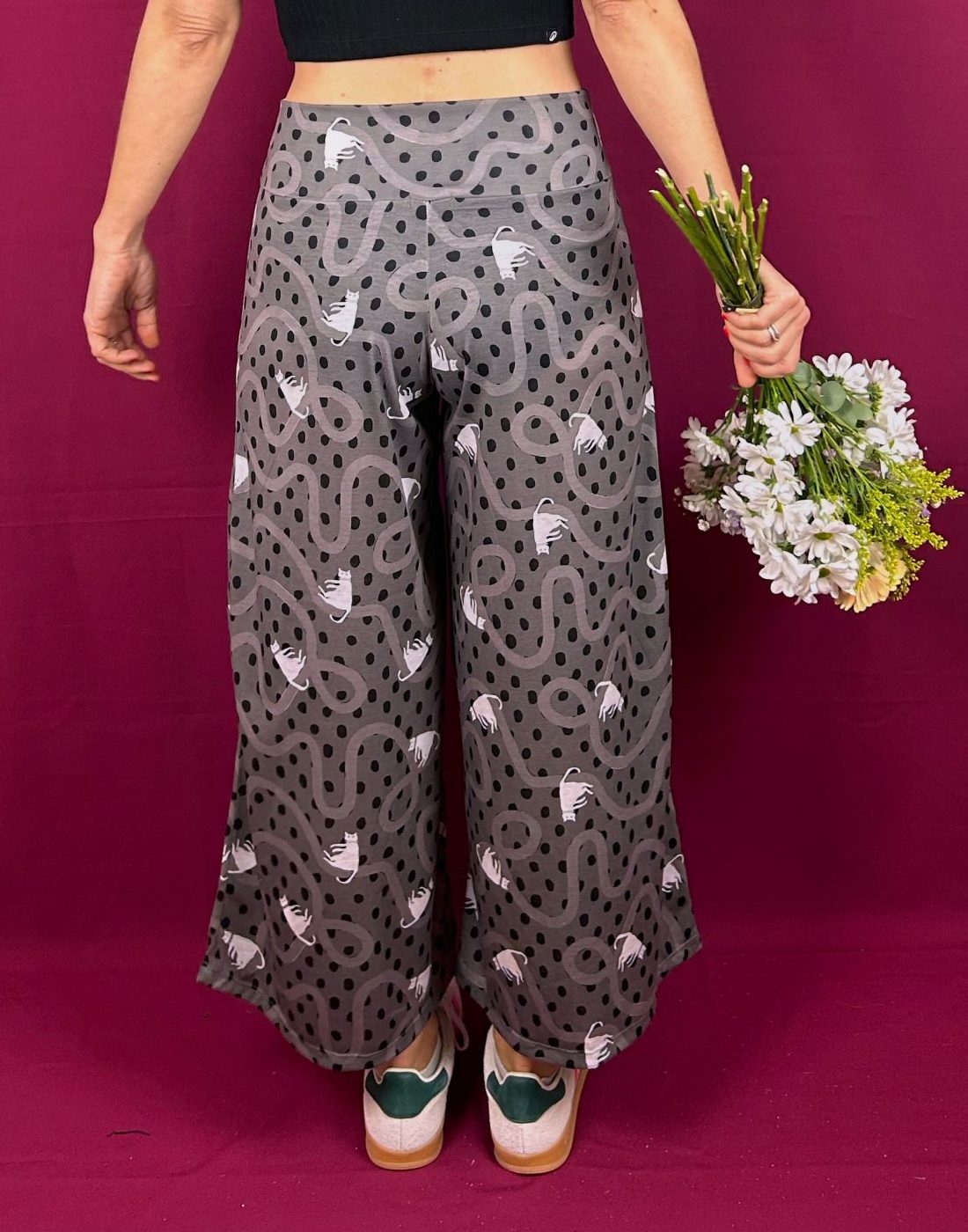 Patrón cropped, amplio, de pierna ancha, de tejido de punto elástico, tiene una textura super bonita, al tacto es muy suave y agradable.