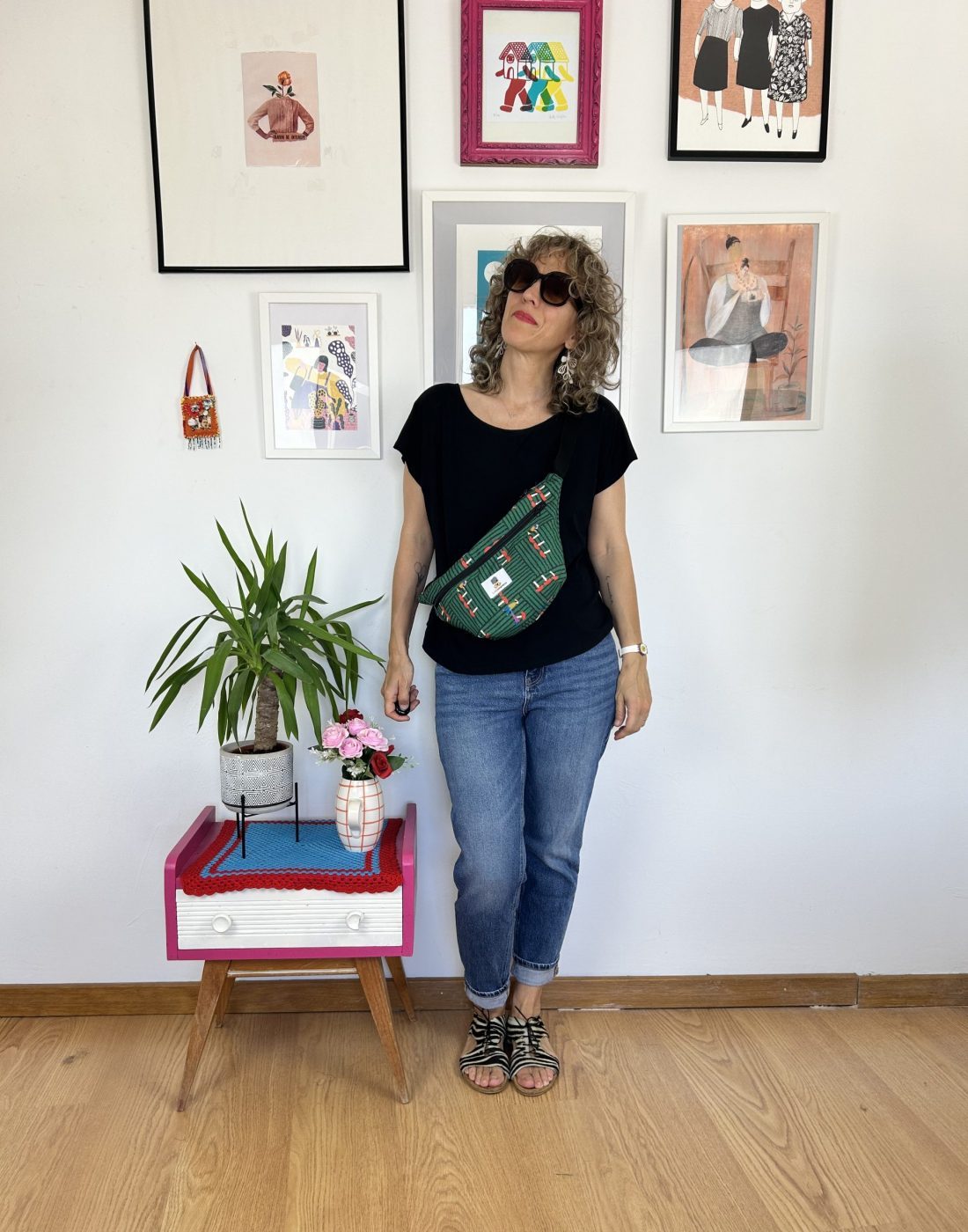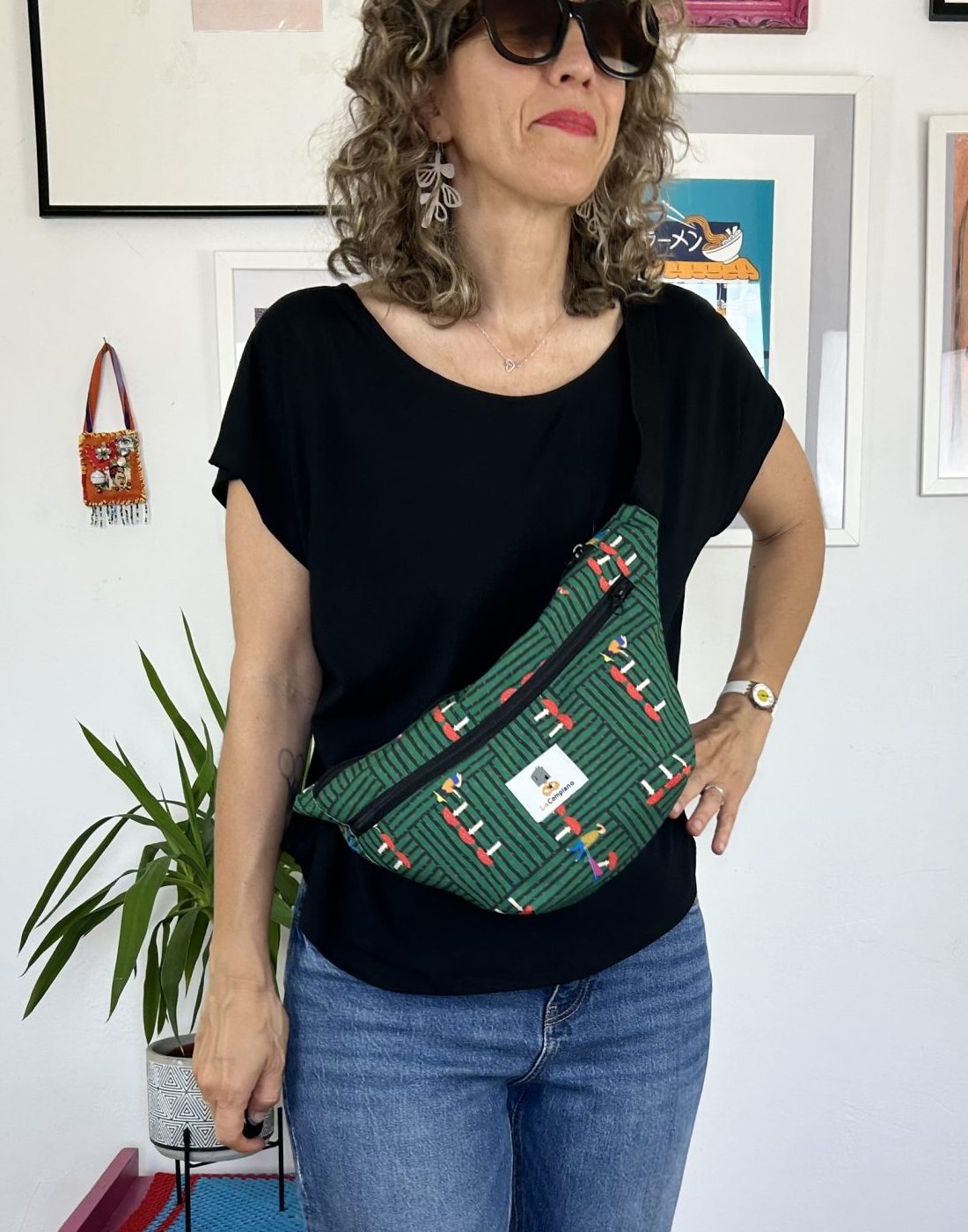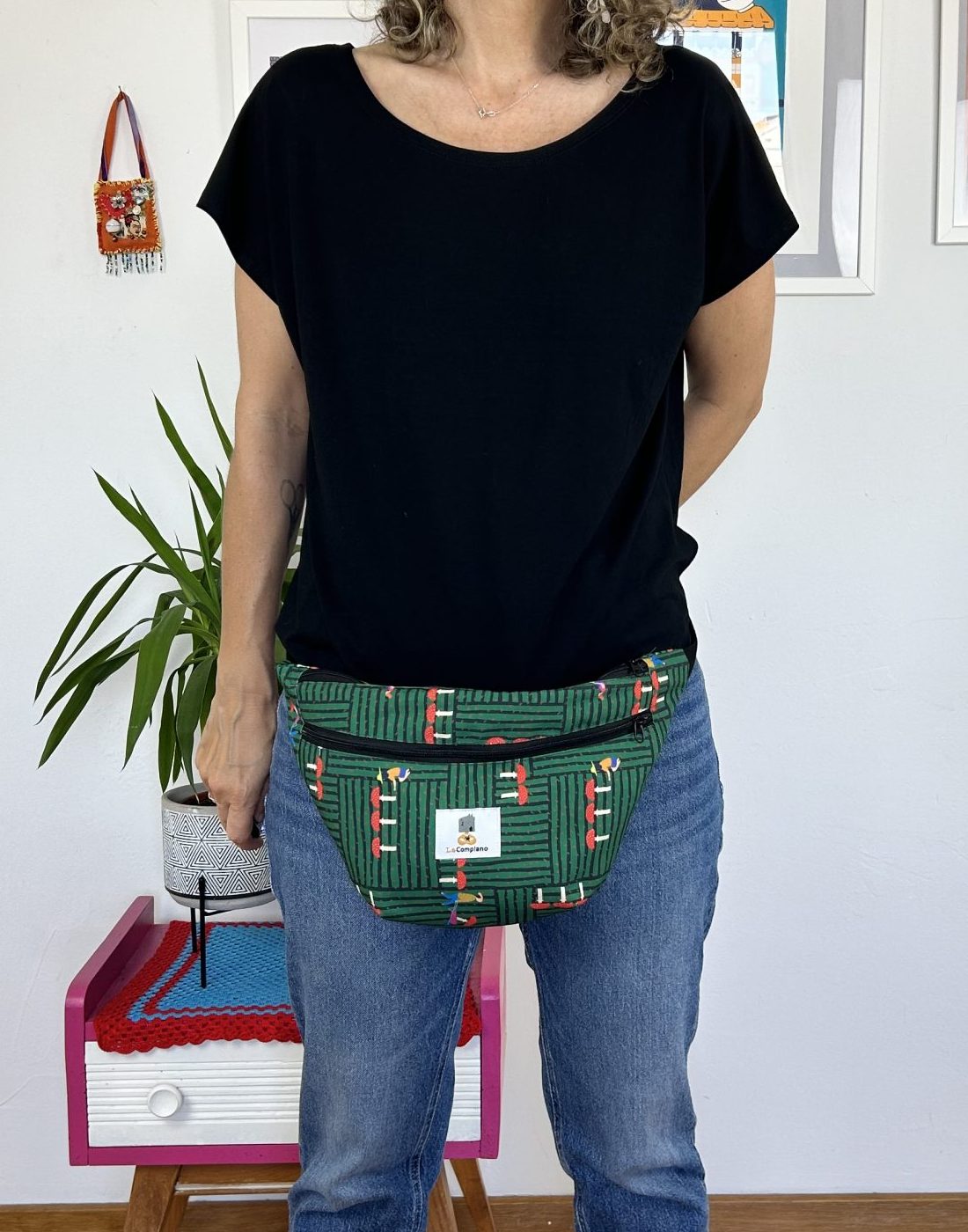Riñonera estupendisima, con doble cremallera. Una superior y otra a modo de super bolsillo en el frente. Tiras regulables y forrada en su interior con pequeño bolsillo. Forro en tejido de algodón. Los diseños son exclusivos de La Compiano.