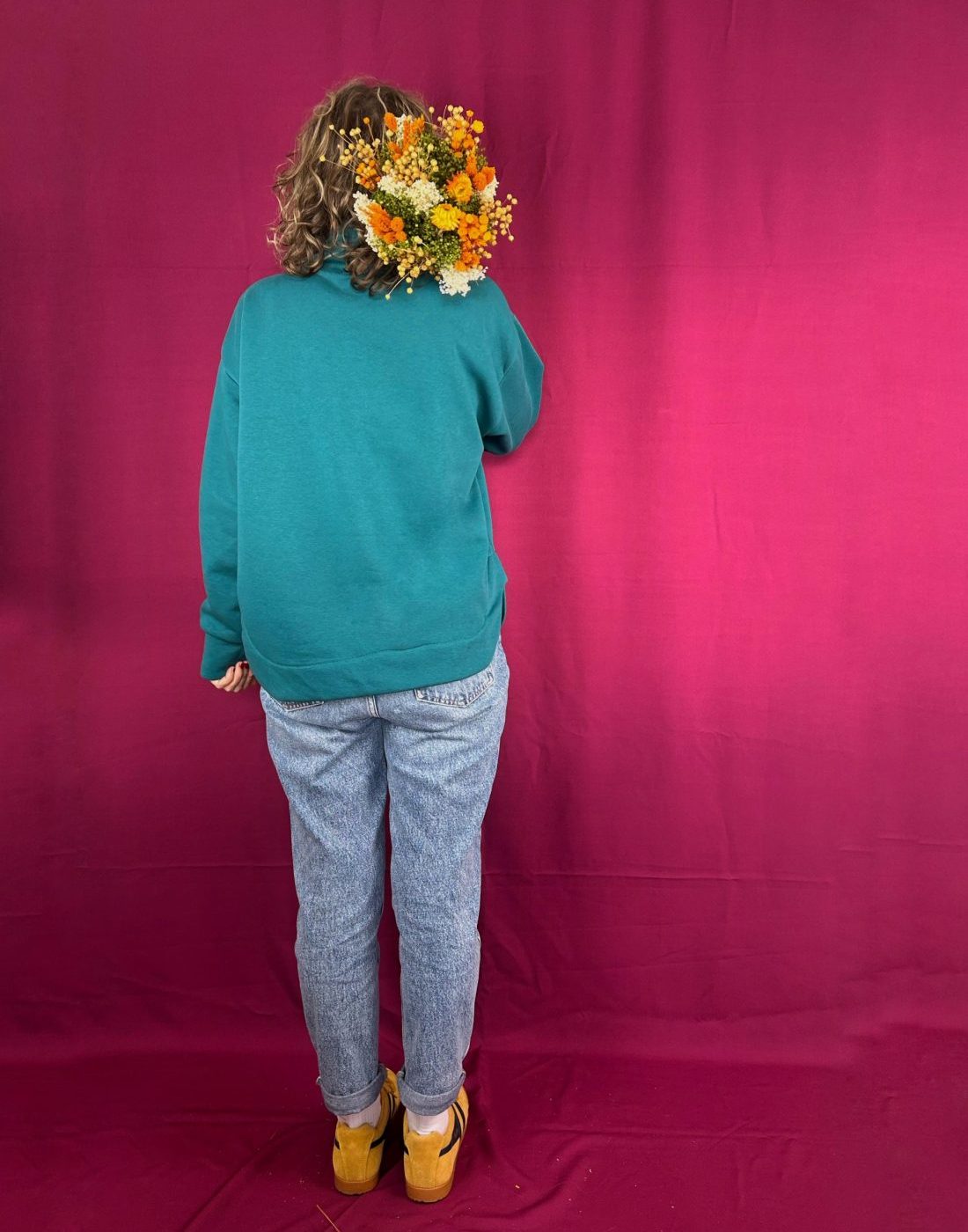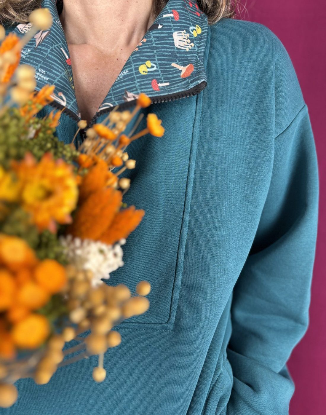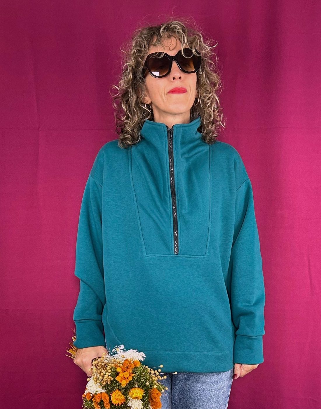 Sudadera con bonito detalle de cremallera en el cuello, con forro estampado dentro. Tiene un tacto super suave y agradable y lleva felpa en su interior.