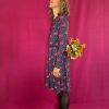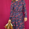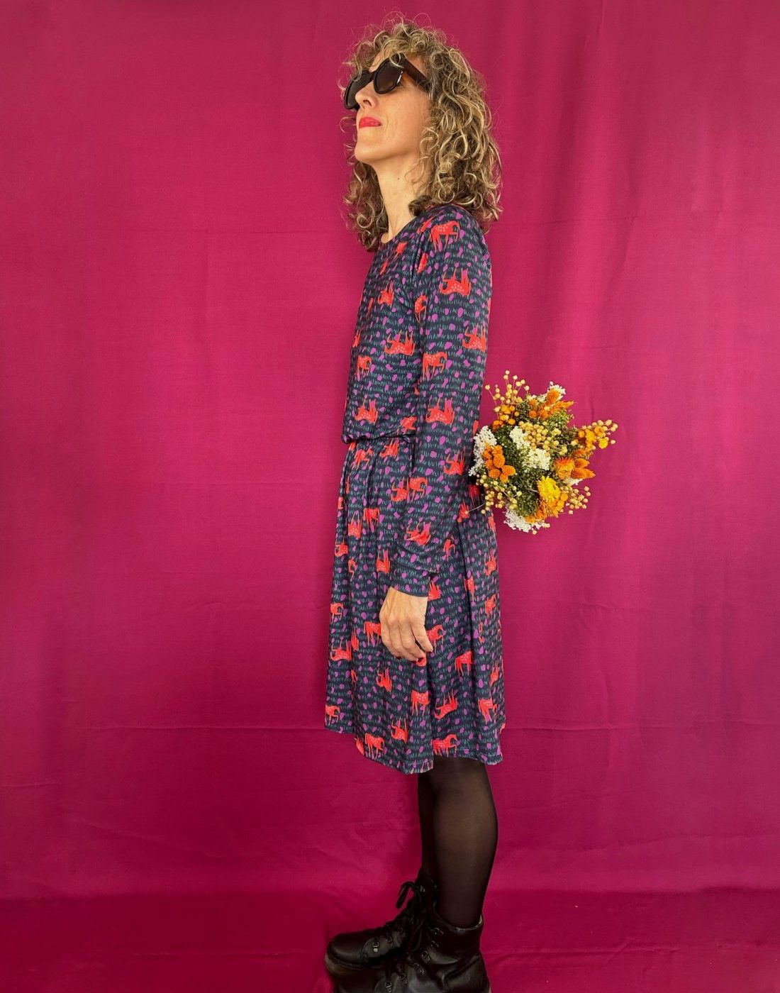 Vestido con cuello redondo y manga larga, con goma en la cintura. Patrón amplio en forma de A. El tacto es muy suave y agradable. Disponible en talla XS hasta a XL