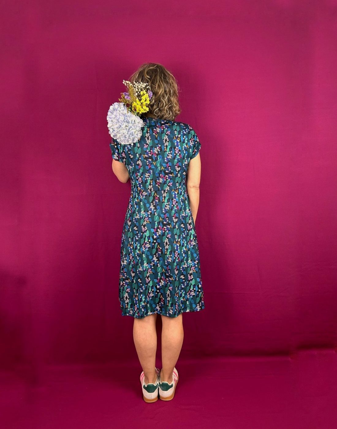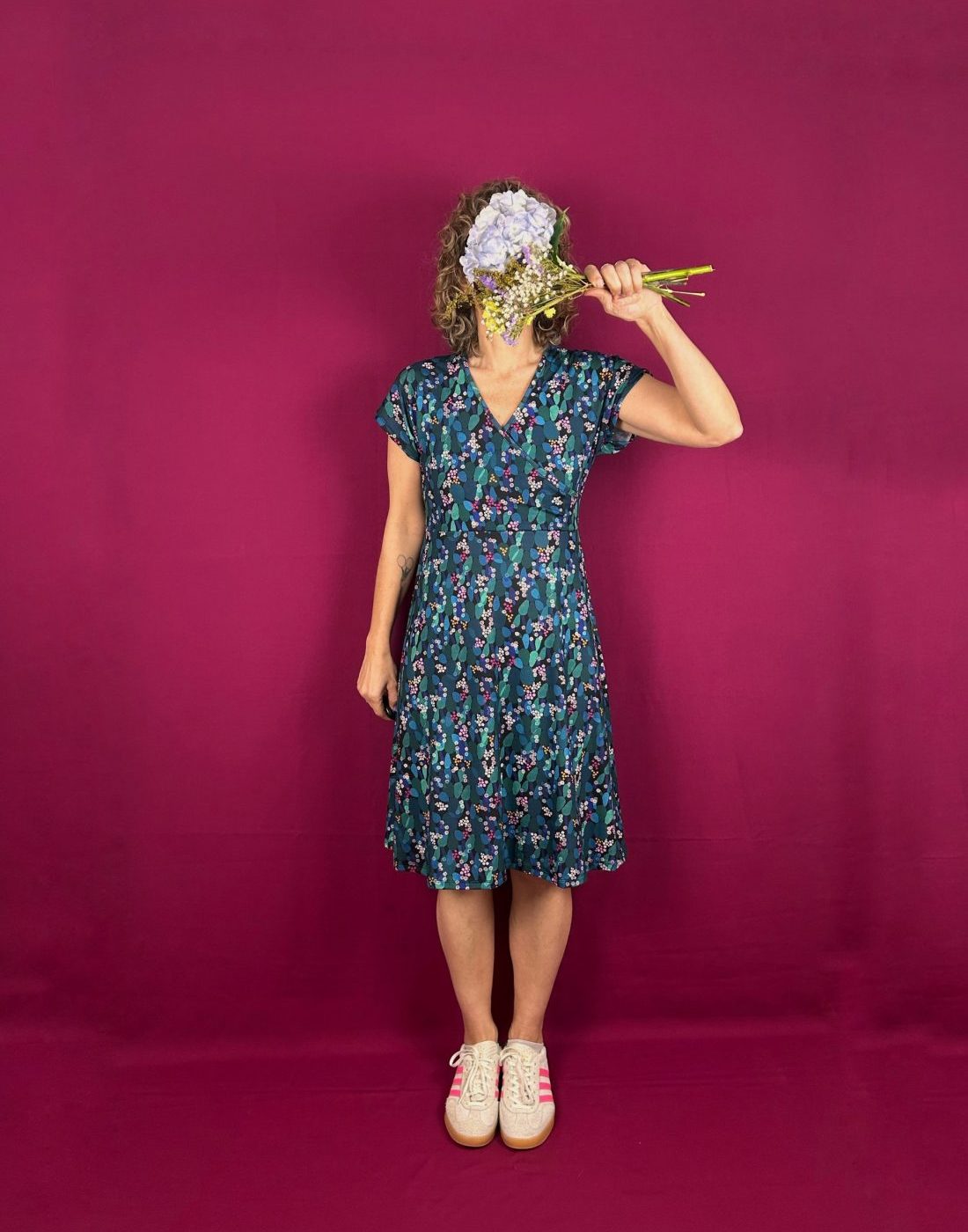 Vestido cruzado de cuello pico y corte en A, de tejido de punto elástico. lleva manga japonesa y recorte en cintura. Tiene un tacto super fresco, suave y agradable. Patrón disponible en 4 tallas. Por el tipo de escote, esta prenda es apta lactancia.