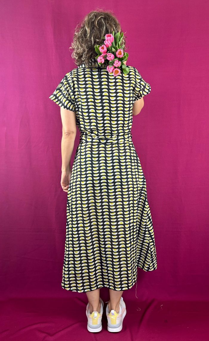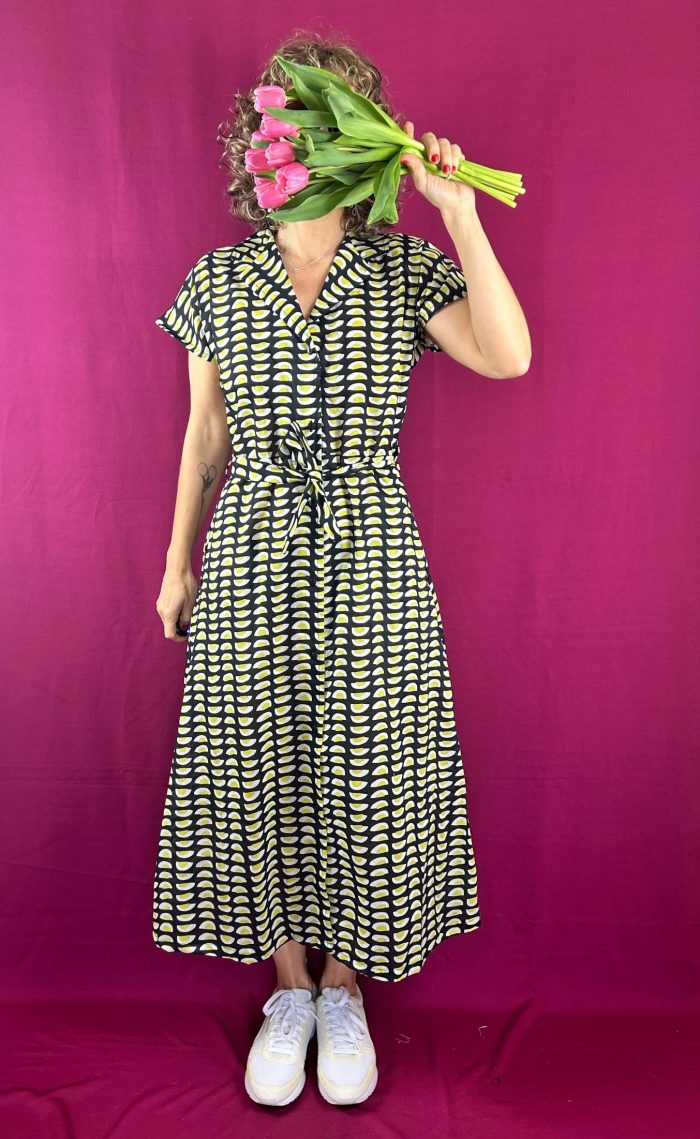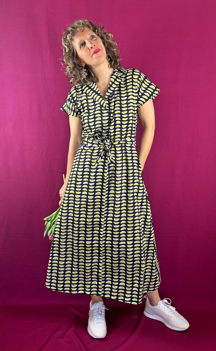 Vestido camisero de popelin de algodón, largo con bolsillos laterales, lazo y botones delanteros. Tiene un cuello en V con una pequeña solapa y un tacto super fresco, suave y agradable. Patrón disponible en 4 tallas. Vestido apto lactancia. Llevo la talla S en las fotos y suelo usar la talla 38.