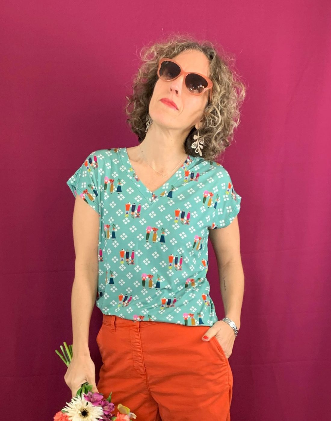 Camiseta de cuello pico en delantera y espalda, de tejido de punto elástico de viscosa. Tiene un tacto super fresco, suave y agradable. Patrón amplio, disponible en 4 tallas. En la foto llevo una talla S
